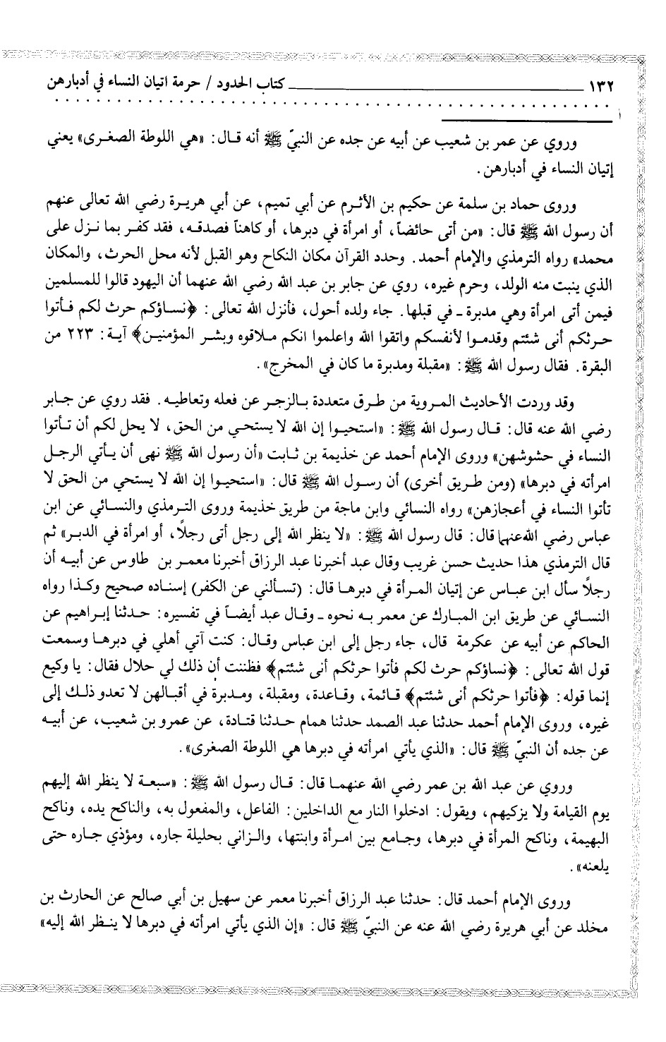 وقد وردت الأحاديث المروية من طرق متعددة بالزجر عن فعله وتعاطيه. فقد روي عن جابر رضي الله عنه قال: قال رسول الله صلى الله عليه وسلم: (استحيوا إن الله لا يستحي من الحق، لا يحل لكم أن تأتوا النساء في حشوشهن) وروى الإمام أحمد عن خذيمة بن ثابت (أن رسول الله صلى الله عليه وسلم نهى أن يأتي الرجل امرأته في دبرها) (ومن طريق أخرى) أن رسول الله صلى الله عليه وسلم قال: (استحيوا إن الله لا يستحي من الحق لا تأتوا النساء في أعجازهن) رواه النسائي وأبن ماجة من طريق خذيمة وروى الترمذي والنسائي عن أبن عباس رضي الله عنهما قال: قال رسول الله صلى الله عليه وسلم: (لا ينظر الله إلى رجل أى رجلاً، أو امرأة في الدبر) ثم قال الترمذي هذا حديث حسن غريب وقال عبد أخبرنا عبد الرزاق أخبرنا معمر بن طاوس عن ابيه أن رواه النسائي عن طريق أبن المبارك عم عمر به نحوه - وقال عبد ايضاً في تفسيره: حدثنا إبراهيم عن الحاكم عن ابيه عن عكرمة قال، جاء رجل إلى أبن عباس وقال: كنات آتي أهلي في دبرها وسمعت قول الله تعالى: {نساؤكم حرث لكم فأتوا حرثكم أنى شئتم} فظننت أن ذلك لي حلال فقال: يا وكيع إنما قوله: {فأتوا حرثم أنى شئتم} قائمة، وقادعدة، ومقبلة، ومدبرة في أقبالهن لا تعدو ذلك إلى غيره، وروى الإمام أحمد حدثنا عبد الصمد حدثنا همام حدثنا قتادة، عن عمرو بن شعيبن عن أبيه عند جده أن النبي صلى الله عليه وسلم قال: (الذي يأتي امرأته في دبرها هي اللوطة الصغرى) .