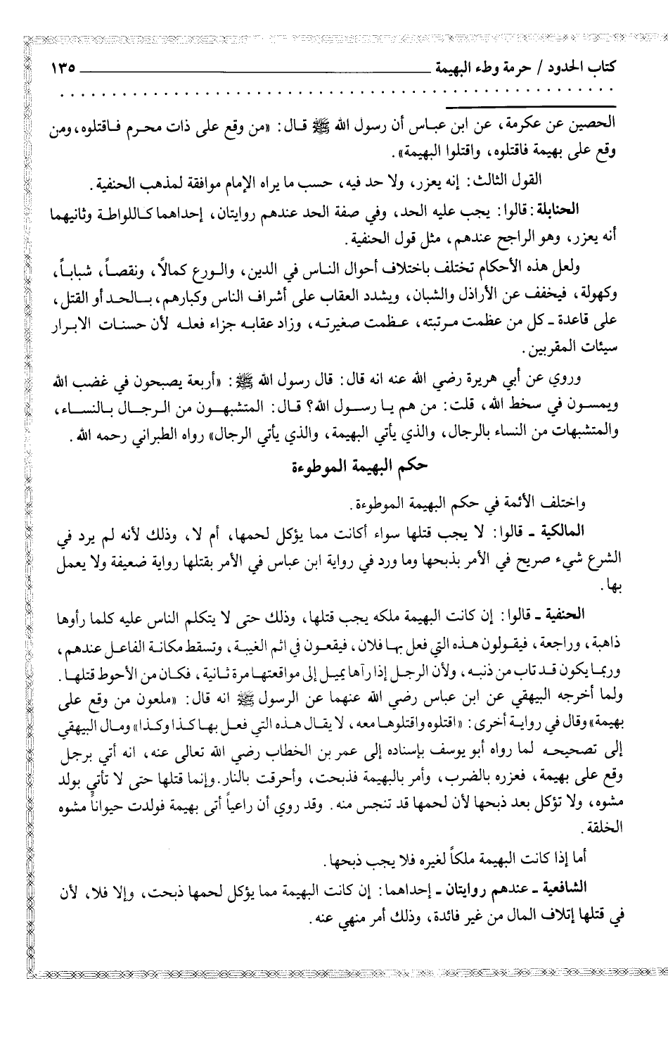 الحصين عن عكرمة، عن أبن عباس أن رسول الله صلى الله عليه وسلم قال: (من وقع على ذات محرم فاقتلوه، ومن وقع على بهيمة فاقتله، واقتلوا البهيمة) . القول الثالث: إنه يعزر، ولا حد فيه، حسب ما يراه الإمام موافقة لمذهب الحنفية.