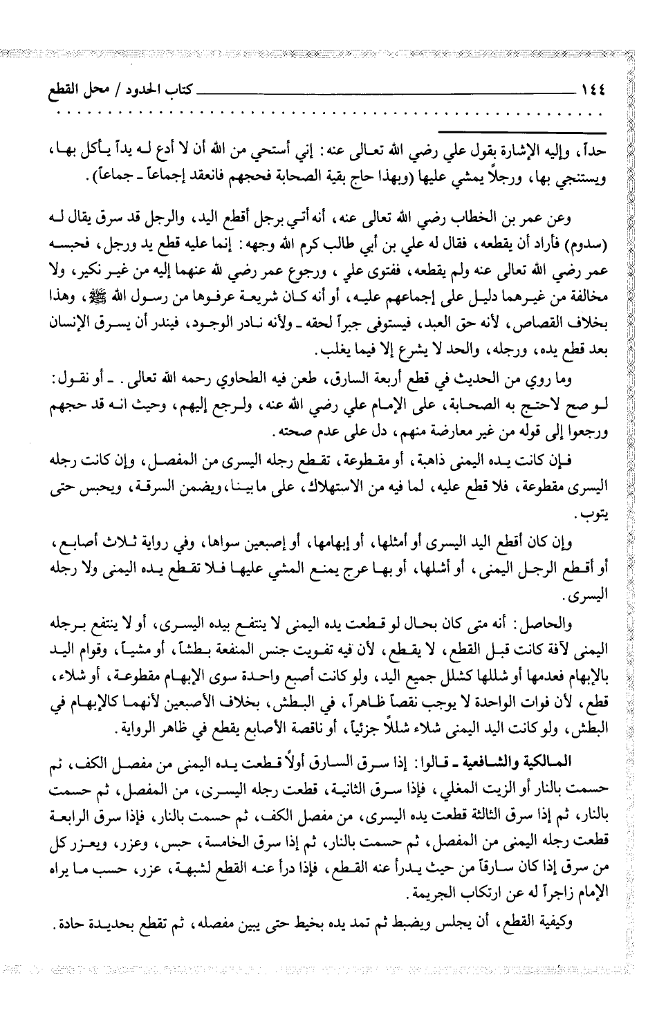 حداً، وإليه الإشارة بقول علي رضي الله تعالى عنه: إني استحي من الله أن لا أدع له يداً يأكل بها، ويستنجي بها، ورجلاً يمشي عليها (وبهذا حاج بقية الصحابة فحجهم فانعقد اجماعاً - جماعاً) . وعن عمر بن الخطاب رضي الله تعالى عنه، أنه أي برجل أقطع اليد، والرجل قد سرق يقال له (سدوم) فأراد أن يقطعه، فقال له على بن أبي طالب كرم الله وجهه: إنما عليه قطع يد ورجل، فحبسه عمر رضي الله تعالى عنه ولم يقطعه، ففتوى على، ورجوع عمر رضي الله عنهما إليه من غير نكير، ولا مخالفة من غيرهما دليل على إجماعهم عليه، أو أنه كان شريعة عرفوها من رسول الله صلى الله عليه وسلم، وهذا بخلاف القصاص، لأنه حق العبد، فيستوفى جبراً لحقه - ولأنه نادر الوجود، فيندر أن يسرق الإنسان بعد قطع يده، ورجله، والحد لا يشرع إلا فيما يغلب. وما روي من الحديث في قطع اربعة السارق، طعن في الطحاوي رحمه الله تعالى - أو نقول: لو صح لا حتج به الصحابة، على الإمام على رضي الله عنه، ولرجع إليهم، وحيث أنه قد حجهم ورجعوا إلى قوله من غير معارضة منهم، جل على عدم صحته.