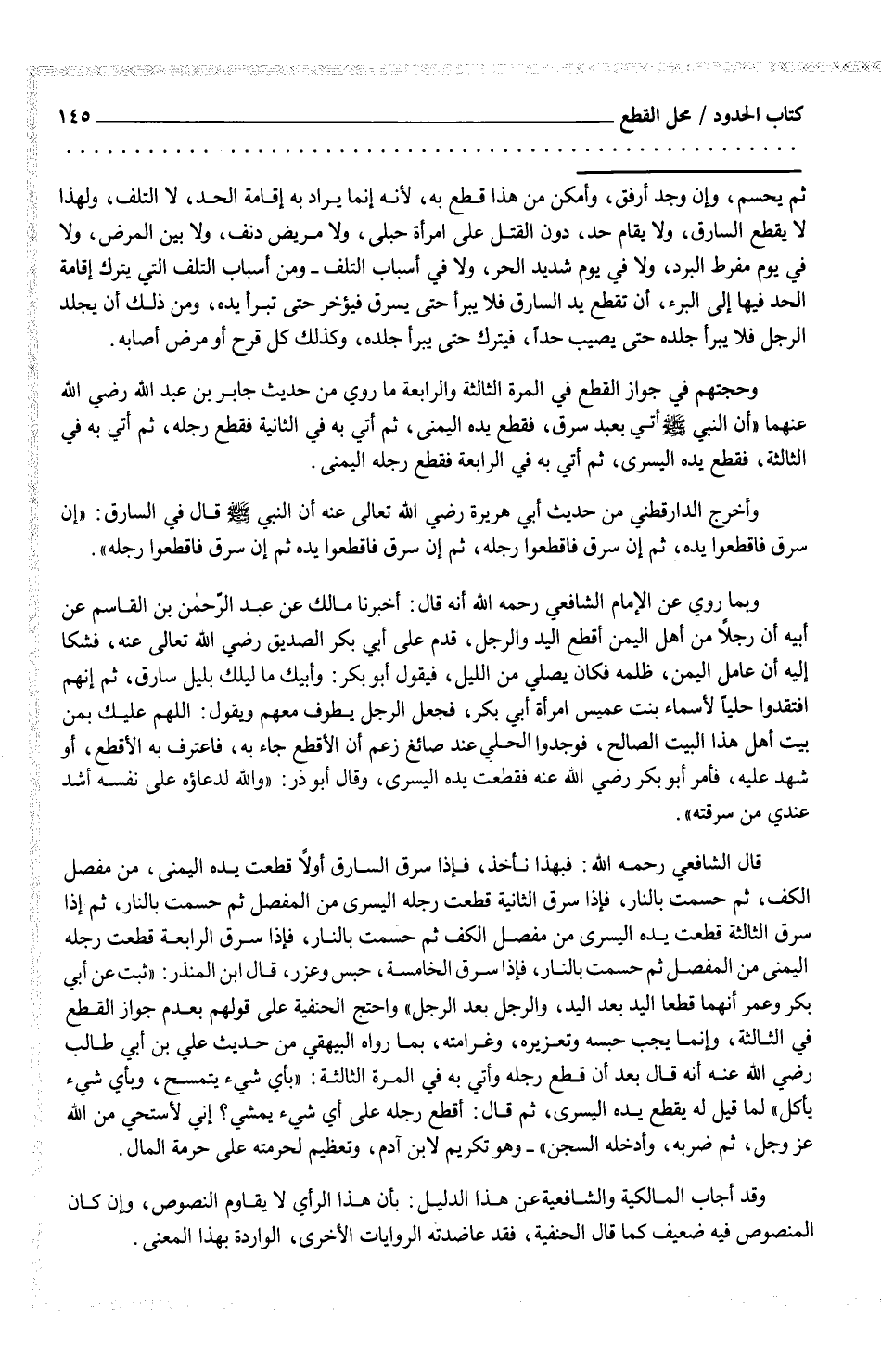 ثم يحسم، وإن وجد ارفق، وأمكن من هذا قطع به، لأنه إنما يراد به غقامة المحد، لا التلف، ولهذا لا يقطع السارق، ولا يقام حد، دون القتل على امرأة حبلى، ولا مريض دنف، ولا بين المرض، ولا في يوم مفرط البرد، ولا في يوم شديد الحر، ولا في أسباب التلف - ومن أسباب التلف الي يترك إقامة الحد فيها إلى البرء، ان تقطع يد السارق فلا يبرأ حتى يسرق فيؤخر حتى تبرأ يده، ومن ذلك ان يجلد الرجل فلا يبرأ جلده حتى يصيب حداً، فيترك حتى يبرأ جلده، وكذلك كل قرح أو مرض أصابه. وحجتهم في جواز القطع في المرة الثالثة والرابعة ما روي من محديث جابر بن عبد اله رضي الله عنهما (أن النبي صلى الله عليه وسلم أي بعبد سرقن فقطع يده اليمنى، ثم أي به في الثانية فقطع رجله، ثم أتي به في الثالثة، فقطع يده اليسرى، ثم أتي به في الرابعة فقطع رجله اليمنى. وأخرج الدارقطني من حديث أبي هريرة رضي الله تعالى عنه أن النبي صلى الله عليه وسلم قال في السارق: (إن سرق فاقطعوا يده، ثم إن سرق فاقطعوا رجله، ثم إن سرق فاقطعوا يده ثم إن سرق فاقطعوا رجله) .
