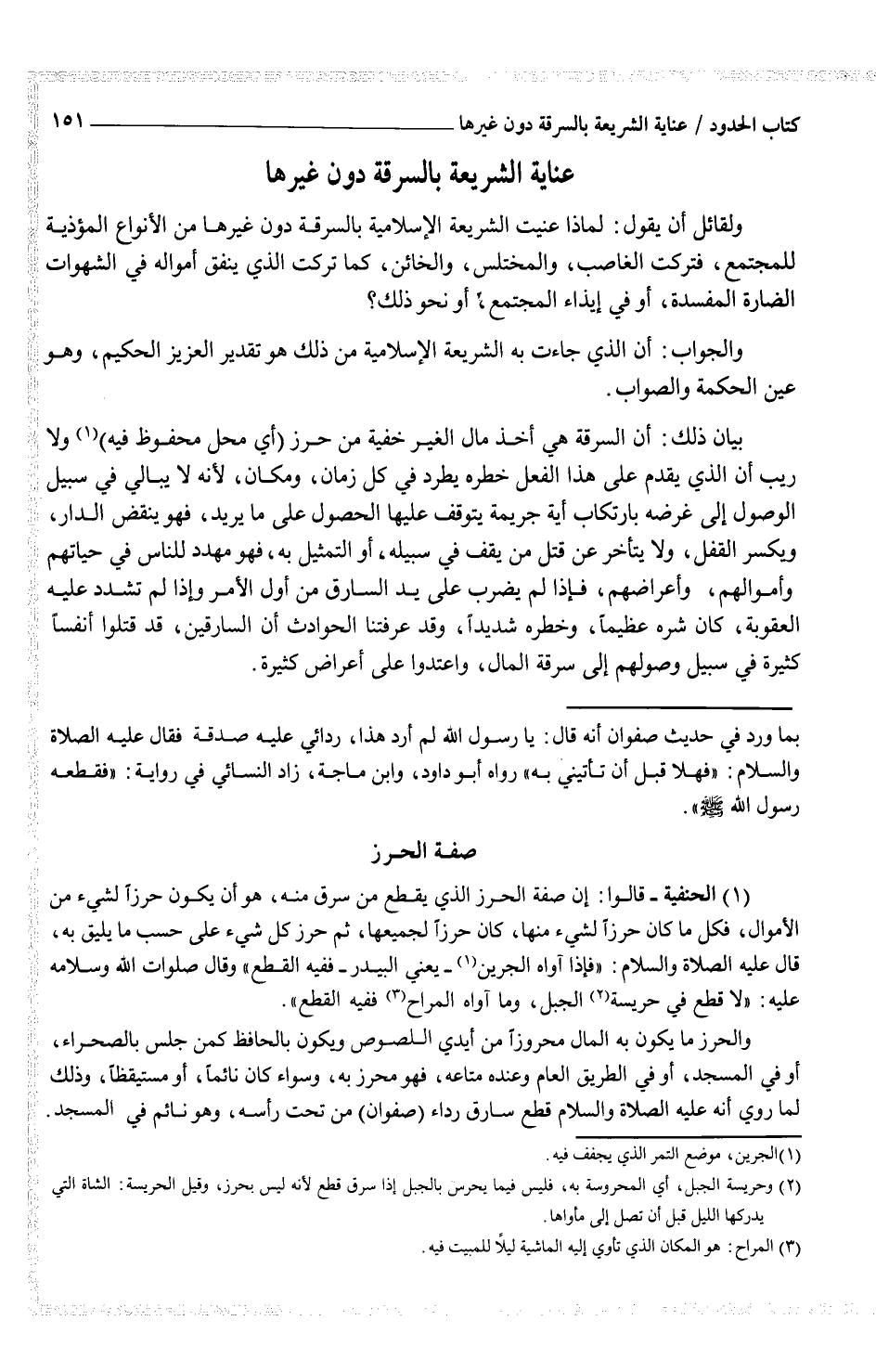 (¬1) (صفة الحرز: الحنفية - قالوا: إن صفة الحرز الذي يقطع من سرق منه، هو أن يكون حرزاً لشيء من الأموال، فكل ما كان حرزاً لشيء منها، كان حرزاً لجميعها، ثم حرز كل شيء على حسب ما يليق به، قال عليه الصلاة والسلام: (فإذا آواه الجرين (موضع التمر اليذي يجفف فيه) - يعني اليدر - ففيه القطع) وقال صلوات الله وسلامه عليه: (لا قطع في حريسة (أي المحروسة به، فليس بالجبل إذا سرق قطع لأنه ليس بحرز، وقيل الحريسة: الشاة التي يدركها الليل قبل أن تصل إلى مأواها) الجبل، وما آواه المراح (هو المكان الذي تأوي إليه الماشية ليلاً للمبيت فيه) ففيه القطع) . والحرز ما يكون به المال محروزاً من أيدي اللصوص ويكون بالحافظ كمن جلس بالصحراء، أو في المسجد، أو في الطريق العام وعنده متاعه، فهو محرز به، وسواء كان نائماً، أو مستيقظاً وذلك لما روي أنه عليه الصلاة والسلام قطع سارق رداء (صفوان) مت تحت رأسه، وهو نائم في المسجد