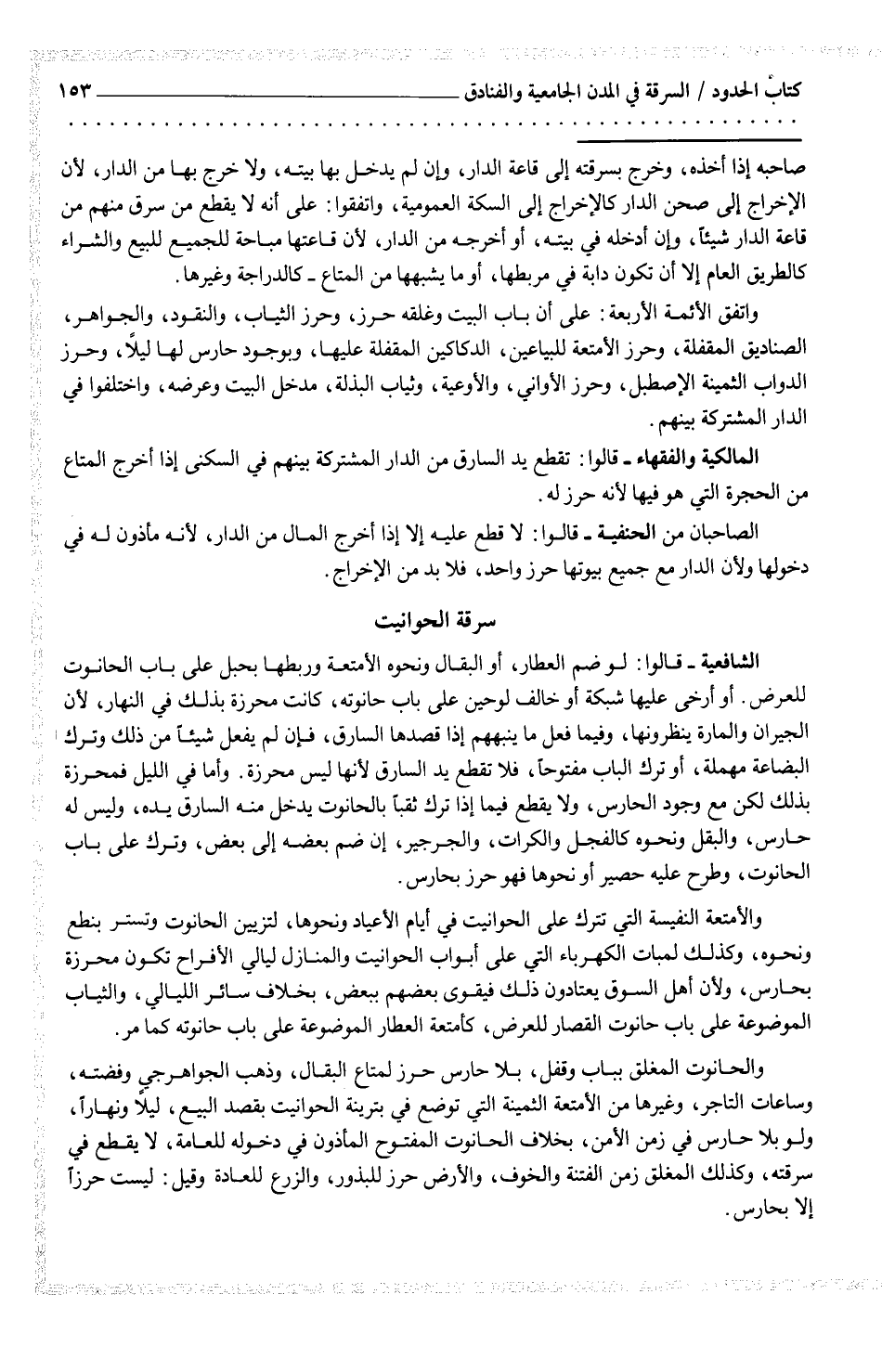 سرقة الحوانيت: الشافعية - قالوا: لو ضم العطار، أو البقال ونحوه المتهة وربطها بحبل على باب الحانوت للعرض. أو ارخى عليها شبكة أو خالف لوحين على باب حانوته، كانت محرزة بذلك في النهار، لأن الجيران والمارة ينظرونها، وفيما فعل ما ينبهم إذا قصدها السارقن فإن لم يفعل شيئاً من ذلك وترك البضاعة مهملة، أو ترك الباب مفتوحاً، فلا تقطع يد السارق لأنها ليس محرزة. وأما في الليل فمحرزة لذلك لكن مع وجود الحارس، ولا يقطع فيما إذا ترك ثقباً بالحانوت يدخل منه السارق يده، وليس له حارس، والبقل ونحوه كالفجل والكرات، والجرجير، إن ضم بعضه إلى بعض، وترك على باب الحانوت، وطرح عليه حصير أو نحوها فهو حرز بحارس. والأمتعة النفيسة التي تترك على الحوانيت في ايام العياد ونحوها، لتزيين الحانوت وتستر بنطع ونحوه، وكذلك لمبات الكهرباء التي على أبواب الحوانيت والمنازل ليالي الأفراح تكون محرزة بحارس، ولأن أهل السوق يعتادون ذلك فيقوى بعضهم ببعض، بخلاف سائر الليالين والثياب الموضوعة على باب حانوت القصار للعرض، كأمتعة العطار الموضوعة على باب حانوته كما مر. والحانوت المغلق بباب وقفل، بلا حارس حرز لمتاع البقال، وذهب الجواهرجي وفضته، وساعات التاجر، وغيرها من الأمتعة الثمينة التي توضع في بترينة الحوانيت بقصد البيع، ليلاً ونهاراً، ولو بلا حارس في زمن المن، بخلاف الحانوت المفتوح المأذون في دخوله للعامة، لا يقطع في سرقته، وكذلك المغلق زمن الفتنة والخوف، والأرض حرز للبذور، والزرع للعادة وقيل: ليست حرزاً إلا بحارس.