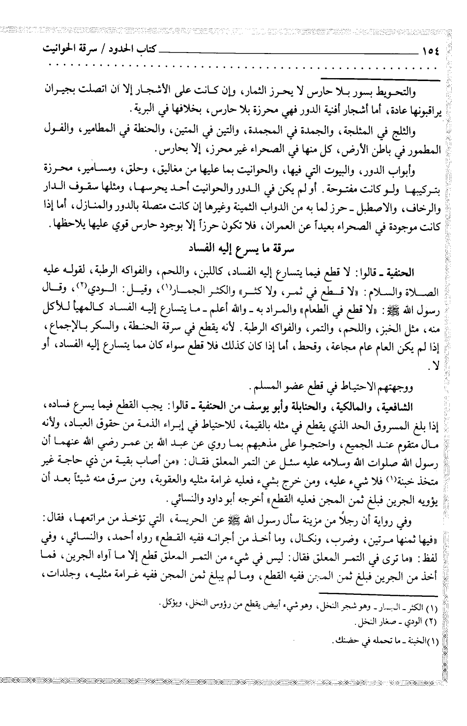 سرقة ما يسرع إليه الفساد: الحنفية - قالوا: لا قطع فيما يتسارع إليه الفساد، كاللبن، واللحم، والفواكه الرطبة، لقوله عليه الصلاة والسلام: (قطع فيما يتسارع في ثمر، ولا كثر) والكثر الجمار (الكثر - الجمار - وهو شجر النخل، وهو شيء أبيض يقطع من رؤوس النخل، ويؤكل) ، وقيل: الودي (الودي - صغار النخل) وقال رسول الله صلى الله عليه وسلم: (لا قطع في الطعام) والمراد به - والله أعلم - ما يتسارع إليه الفساد كالمهيأ للأكل منه، مثل الخبز، واللحم، والتمر، والفواكه الرطبة، لأنه يقطع في سرقة الحنطة، والسكر بالإجماع، إذا لم يكن العام عام مجاعة، وقحط، اما إذا كان كذلك فلا قطع سواء كان مما يتسارع إليه الفساد، أو لا. ووجهتهم الاحتياط في قطع عضو المسلم. والشافعية والمالكية، والحنابلة وأبو يوسف من الحنفية - قالوا: يجب القطع فيما يسرع فساده، إذا بلغ المسروق الحد الذي يقطع في مثله بالقيمة، للأحتياط في إبراء الذمة من حقوق العباد، ولأنه مال متقوم عند الجميع، واحتجوا على مذهبهم بما روي عن عبد الله بن عمر رضي الله عنهما أن رسول الله صلوات الله وسلامه عليه سئل عن التمر المعلق فقال: (من أصاب بقية من ذي حاجة غير متخذ خبنة (الخبنة - ما تحمله في حضنك) فلا شيء عليه، ومن خرج بشيء فعليه غرامة مثليه والعقوبة، ومن سرق منه شيئاً بعد ان يؤويه الجرين فبلغ ثمن المجن فعليه القطع) أخرجه أبو داود والنسائي.
