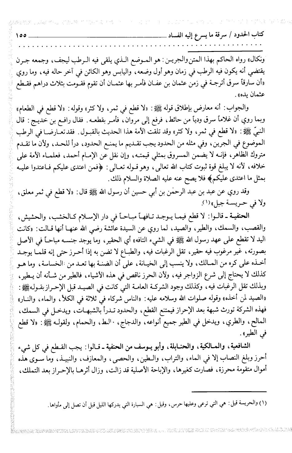 ونكال رواه الحاكم بهذا المتن والجرين: هو الموضع الذي يلقى فيه الرطب ليجف، وجمعه جرن يقتضي أنه يكون فيه الرطب في زمان وهو اول وضعه، واليابس وهو الكائن في آخر حاله فيه، وما روي (ان سارقاً سرق اتوجة في زمان عثمان بن عفان فأمر بها عثمان أن تقوم فقومت بثلاث دراهم فقطع عثمان يده) . والجواب: أنه معارض بإطلاق قوله صلى الله عليه وسلم: (لا قطع في ثمر، ولا كثر) وقوله: (لا قطع في الطعام) وبما روي أن غلام سرق ودياً من حائط، فرفع إلى مراوان، فأمر بقطعه. فقال رافع بن خديج: قال النبي صلى الله عليه وسلم: (قطع في ثمر، ولا كثر) وقد تلقت الأمة هذا الحديث بالقبول. فقد تعارضا في الرطب الموضوع في الجرين، وفي مثله من الحدود يجب تقديم ما يمنع الحدود، درأ للحد، ولأن ما تقدم متروك الظاهر، فإنه لا يضمن المسروق بمثلي قيمته، وإن نقل عن الإمام أحمد، فقلماء المة على خلافه، لأنه لا يبلغ قوة ثبوت كتاب الله تعالى' وهو قوله تعالى: {فمن اعتدى عليكم فاعتدوا عليه بمثل ما اعتدى عليكم} فلا يصح عنه عليه الصلاة والسلام ذلك. وقد روي عن عبد بن عبد الرحمن بن أبي حسين أن رسول الله صلى الله عليه وسلم قال: (لا قطع في ثمر معلق، ولا في حريسة جبل) (والحريسة قيل: هي التي ترعى وعليها حرس، وقيل هي السيارة التي يدركها الليل قبل أن تصل إلى مأواها)