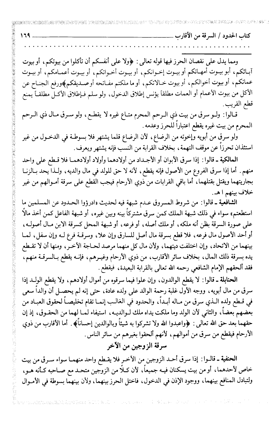 الحنابلة قالوا: لا يقطع الوالدون، وإن علوا فيما سرقوه من أموال أولادهم، ولا يقطع الولد إذا سرق من مال أبويه، ووجه الولد غلبة رحمة الوالد على ولده عادة، حتى أنه لم يحصل أن والداً سعى في قطع ولده الذي سرق من ماله ابداً والحدود في الغالب إنما تقام تخليصاً لحقوق العباد من بعضهم بعضاً، والثاني لأن الولد وما ملكت يداه ملك لوالديه، استيفاء لما لهما من الحقوق، إذ إن حقهما بعد حق الله تعالى: {واعبدوا الله ولاتشركوا به شيئاً وبالوالدين إحساناً} . أما الأقارب من ذوي الأرحام فيقطع من سرق من أموالهم، لأنهم ألحقوا بغيرهم من سائر الناس.