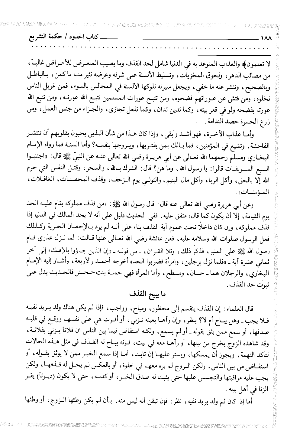 وعن أبي هريرة رضي الله تعالى عنه قال: قال رسول الله صلى الله عليه وسلم: (من قذف مملوكه يقام عليه الحج يوم القيامة، إلا أن يكون كما قال) متفق عليه. ففي الحديث دليل على أنه لا يحد المالك في الدنيا أذا قذف مملوكه، وإن كان جاخلاً تحت عموم آية القذف بناء على أنه لم يرد بالإحصان الحرية وكذلك فعل الرسول صلوات مالله وسلامه عليه، فعن عائشة رضي الله تعالى عنها قالت: لما نزل عذري قام رسول الله صلى الله عليه وسلم على المنبر، فذكر ذلك، وتلا القرآن، من قوله (ن الذين جاؤوا بالإفك) إلى آخر ثماني عشرة آية (فما نزل برجلين، وامراة فضربوا الحد) أخرجه أحمد والأربعة، وأشار أليه الإمام البخاري، والرجلان هما حان، ومسطح، وأما المرأة فهي حمنة بنت جحش فالحديث يدل على ثبوت حد القذف.