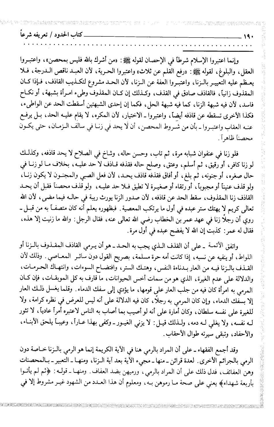 وإنما اعتبروا الإسلام شرطاً في الإحصان لقوله صلى الله عليه وسلم: (من أشرك بالله فليس بمحصن) ، واعتبروا العقل، والبلوغ، لقوله صلى الله عليه وسلم: (رفع القلم عن ثلاث) واعتبروا الحرية، لأن العبد ناقص الدرجة، فلا يعظم عليه التعيير بالزنا، واعتبروا العفة عن الزنا، لأن الحد مشروع لتكذيب القاذف، فإذا كان المقذوف زانياً، فالقاذف صاق في القذف، وكذلك إن كان المقذوف وطىء امرأة بشبهة، أو نكاح فاسد، لآن فيه شبهة الزنا، كما فيه شبهة الحل، فكما إن احجى الشبهتين اسقطتت الحد عن الواطىء، فكذا الأخرى تسقطه عن قاذفه أيضاً، واعتبروا الاختيار، لأن المكره، لا يقام عليه الحد، بل يرفع عنه العقاب واعتبروا بها، من شروط المحصن، ان لا يحد في زنا في سالف الزمان، حتى يكون محصناً ظاهراً.
