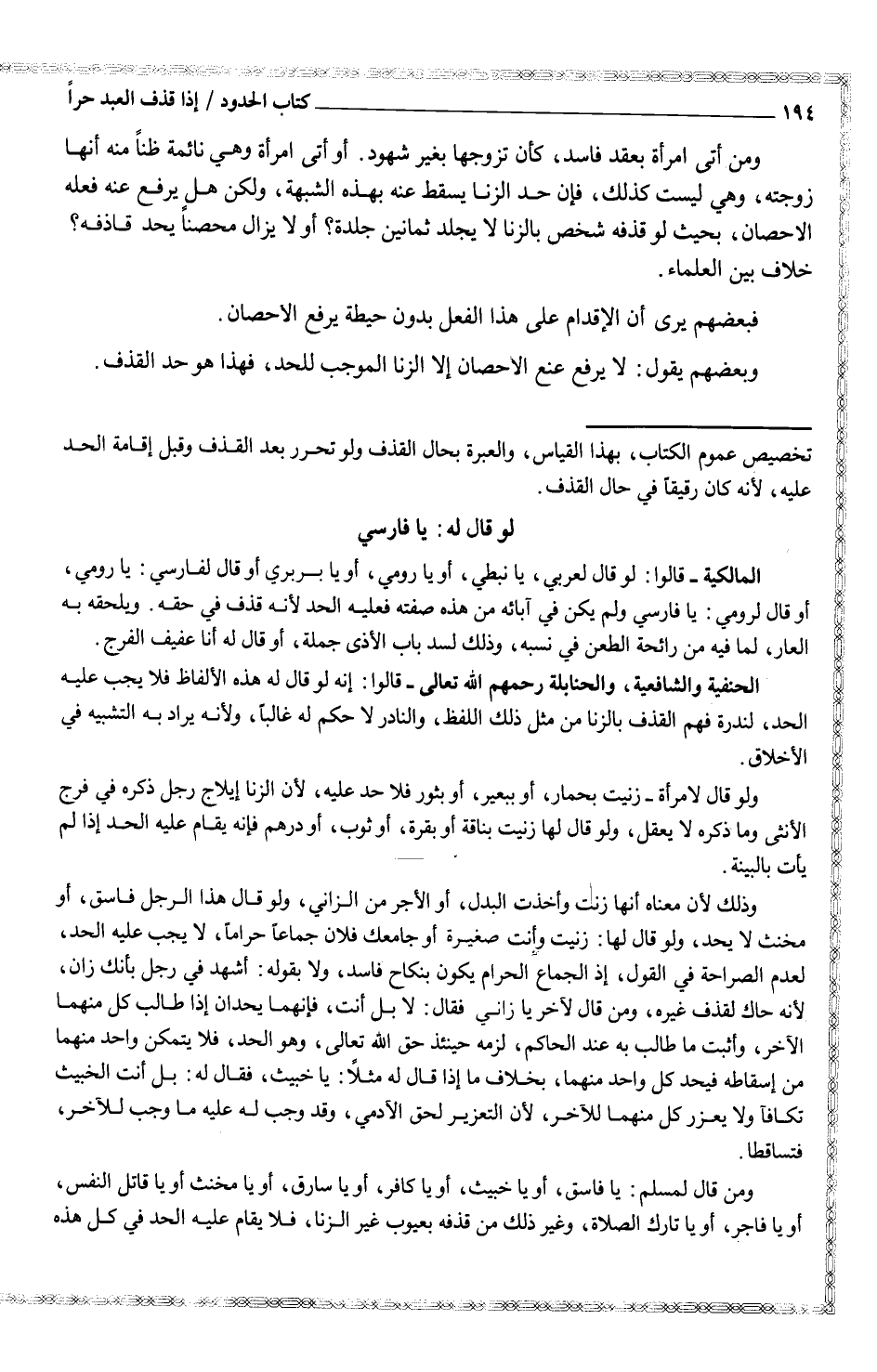 المالكية قالوا: لو قال لعربي، يا نبطي، أو يا رومي، أو يا بربري أو قال لفارسي: يا رومي، أو قال لرومي: يا فارسي ولم يكن في آبائه من هذه صفته فعليه الحد لأنه قذف في حقفه. ويلحقه به العار، لما فيه من رائحة الطعن في نسبه، وذلك لسد باب الأذى جملة، أو قال له أنا عفيف الفرج.