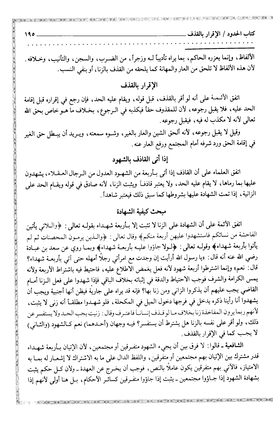 اتفق الأئمة على أن الشهادة على الزنا لا تثبت إلا بأربعة شهداء بقوله تعالى: {واللاتي يأتين الفاحشة من نسائكم فاستشهدوا عليهن أربعة منكم} وقال تعالى: {والذين يرمون المحصنات ثم لم يأتوا بأربعة شهداء} وقوله تعالى: {لولا جاءوا عليه بأربعة شهداء} وبما روي عن سعد بن عبادة رضي الله عنه أنه قال: (يا رسول الله أرايت إن وجدت مع امرأتي رجلاً أمهله حتى آتي بأربعة شهداء. قال: نعم) وإنما اشترطوا أربعة شهود لأنه فعل يغمض الاطلاع عليه، فاحتيط فيه باشتراط الأربعة ولأنه يمس الكرامة والشرف فوجب الاحتياط والقة في إثباته بخلاف الباقي فإذا شهدوا على فعل الزنا أمام القضي يجب عليهم أن يذكروا الزاني ومن زنا بها؟ فأنه قدر يراه على جارية فيظن أنها أجنبية ويجب أن يشهدوا أنا رأينا ذكره يدخل في فرجها دخول الميل في المكحلة، فلو شهدوا مطلقاً أنه زنى لا يثبت، لأنهم ريما يرون المفاخذة زنا بخلاف ما لو قذف إنساناً فاعترف وقال: زنيت يجب الحد ولا يستفسر عن ذلك، ولو أقر على نفسه بالزنا هل يشترط أن يستفسر؟ فيه وجهان (أحدهما) نعم كالشهود (والثاني) لا يجب كما في الإقرار بالقذف.