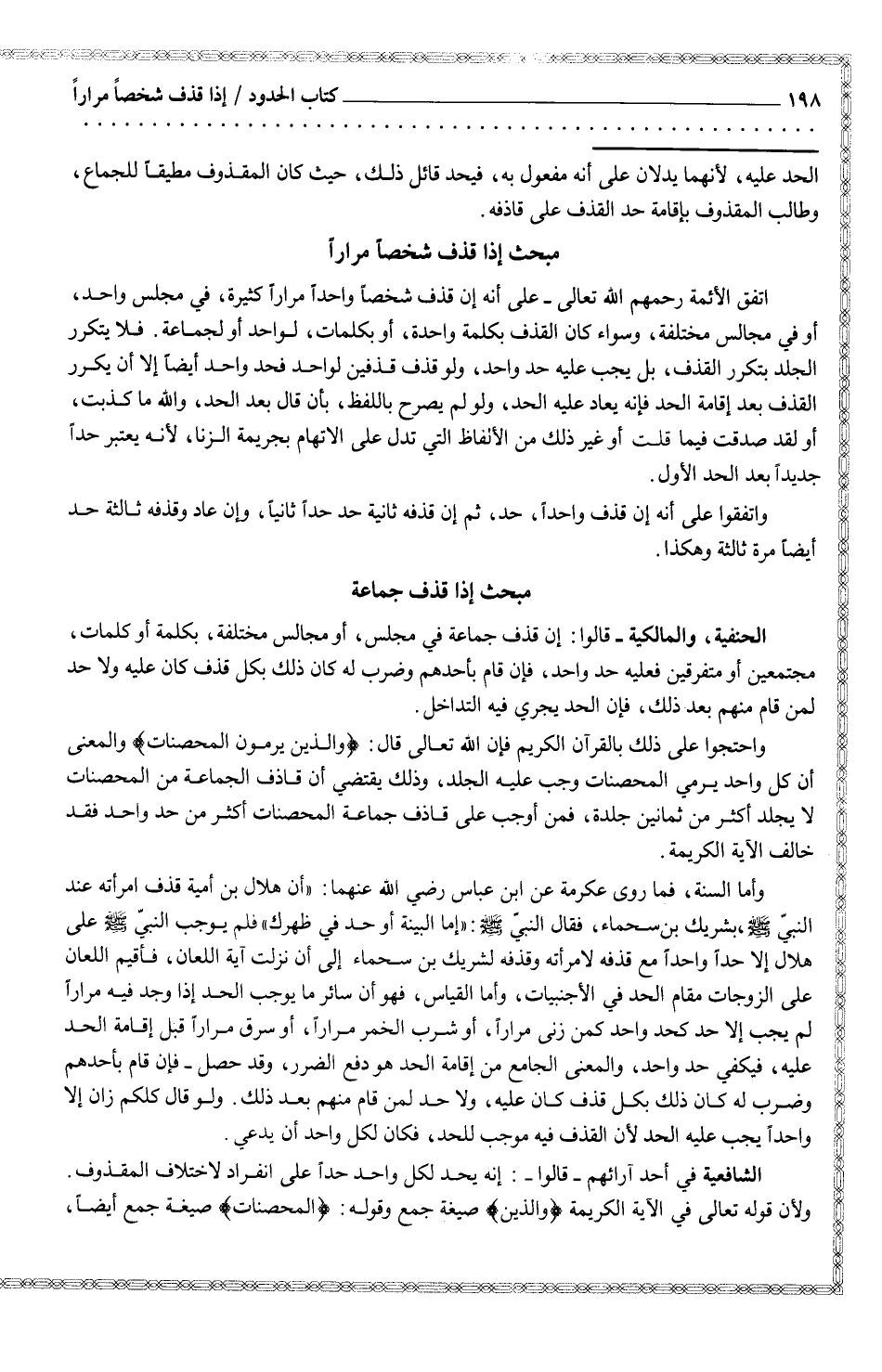 وأما السنة، فما روى عكرمة عن أبن عباس رضي الله عنهما: (أن هلال بن امية قذف امرأته عند النبي صلى الله عليه وسلم، بشريك بن سحماء، فقال النبي صلى الله عليه وسلم: (إما البينة أو حد في ظهرك) لم يوجب النبي صلى الله عليه وسلم على هلال إلا حداً واحداً مع قذفه لامرأته وقذفه لشريك بن سحماء إلى أن نزلت آية اللعان، فأقيم اللعان على الزوجات مقام الحد في الأجنبيات، وأما القياس،، فهو أن سائر ما يوجب الحد إذا وجد فيه مراراً لم يجب إلا حد كحد واحد كمن زنى مراراً، أو شرب الخمر مراراً أو سرق مراراً قبل إقامة الحد عليه، فيكفي حد واحد، والمعنى الجامع من إقامة الحد هو دفع الضرر، وقد حصل فإن قام بأحدهم وضرب له كان ذلك بكل قذف كان عليه، ولا حد لمن قام منهم بعد ذلك. ولو قال كلكم زان إلا واحداً يجب عليه الحد لأن القذف فيه موجب للحد، فكان لكل واحد أن يدعي.