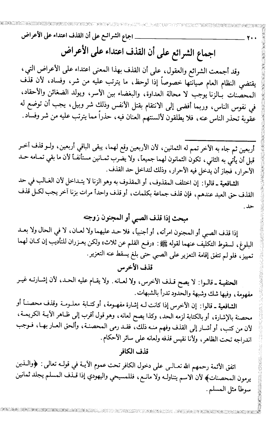-وقد اجمعت الشرائع والعقول، على أن القذف بهذا المعنى اعتداء على الأعراض التي، يقتضي النظام العام صيانتها خصوصاً إذا لوحظ، ما يترتب عليه من شر، وفاسدن لأن قذف المحصنات بالزنا يوجب لا محالة العداوة، والبغضاء بين الأسر، ويولد الضغائن والأحقاد، في نفوس الناس، وربما أفضى إلى الانتقام بقل النفس وذلك شر وبيل، يجب أن توضع له عقوبة تحذر الناس عنه، فلا يطلقون لألسنتهم العنان فيه، حذراً مما يترتب عليه من شر وفساد.