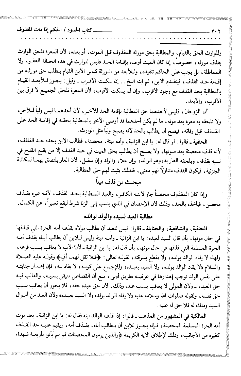الحنفية، والشافعية، والحنابلة قالوا: ليس للعبد أن يطالب مولاه بقذف أمه الحرة التي قذفها في حال موتها، بأن قال السيد لعبده: يا أبن الزانية وأمه ميتة وليس للابن أن يطالب أباه بقذف امه الحرة المسلمة التي قذفها في حال موتها، بأن قال له: با أبن الزانية لأن الب لا يعقاقب بسبب فرعه، ولهذا لا يقاد الوالد بولده، ولا يقطع بسرقته، لقوله تعالى: {فلا تقل لهما أفٍ} وقوله عليه الصلاة والسلام (لا يقاد الوالد بولده، ولا السيد بعبده) وللإجماع على كونه، لا يقاد به، فإن غهدار جنايته على نفس الولد توجب إهدارها في عرضه بطريق أولى، مع أن القصاص متيقن بسببه، والغالب فيه حق العبد، ولأن المولى لا يعاقب بسبب عبده وذلك، لأن حق عبده حقه، فلا يجوز أن يعاقب بسبب حق نفسه، ولقثول صلوات الله وسلامه عليه (لا يقاد الوالد بولده ولا السيد بعبده) ولان العبد من أموال السيد وملك له فلا حق له عليه.