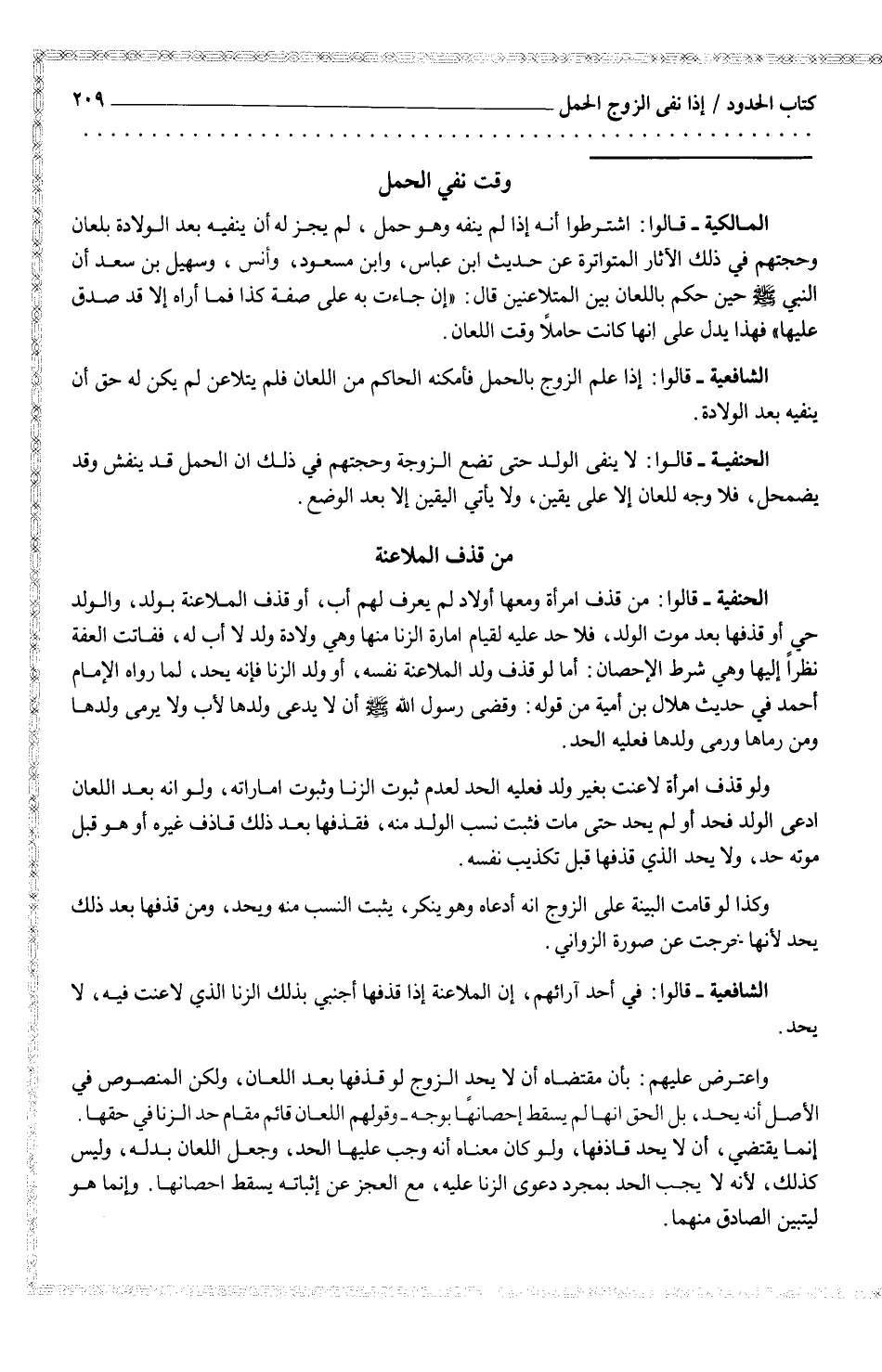 المالكية - قالوا: اشترطوا أنه إذا لم ينفه وهو حمل، لم يجز له أن ينفيه بعد الولادة بلعان وحجتهم في ذلك الآثار المتواترة عن حديث أبن عباس، وأبن مسعودن وأنس، وسهيل بن سعد أن النبي صلى الله عليه وسلم حين حكم باللعان بين المتلاعنين قال: (إن جاءت به على صفة كذا فما أراه إلا قد صدق عليها) . فهذا يدل على أنها كانت حاملاً وقت اللعان.