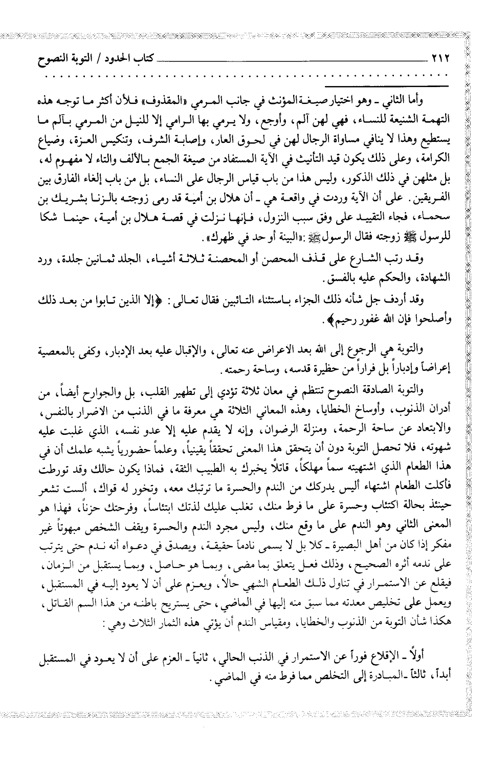 والتوبة الصادقة النصوح تنتظم في معان ثلاثة تؤدي إلى تطهير القلب، بل والجوارح أيضاً، من أدران الذنوب، وأوساخ الخطايا، وهذه المعاني الثلاثة هي معرفة ما في الذنب من الإضرار بالنفس، والابتعاد عن ساحة الرحمة، ومنزلة الرضوان، وإنه لا يقدم عليه إلا عدو نفسه، الذي غلبت عليه شهوته، فلا تحصل التوبة دون أن يتحقق هذا المعنى تحققاً يقيناً، وعلماً حضورياً يشبه علمك أن في هذا الطعام الذي اشتهيته سماً مهلكاً، قاتلاً يخبرك به الطبيب الثقة، فماذا يكون حالك وقد تورطت فأكلت الطعام اشتهاء أليس يدركك من الندم والحسرة ما ترتبك معه، وتخور له قواك، ألست تشعر حينئذ بحالة اكتئاب وحسرة على ما فرط منك، تغلب عليك لذتك ابتئاساً - وفرحتك حزناً، فهذا هو المعنى الثاني وهو الندم على ما وقع منك، وليس مجرد الندم والحسرة ويقف الشخص مبهوتاً غير مفكر إذا كان من أهل الصيرة كلا بل لا يسمى نادماً حقيقة، ويصدق في دعواه أنه ندم حتى يترتب على ندمه أثره الصحيح، وذلك فعل يتعلق بما مضى، وبما هو حاصل، وبما يستقبل من الزمان، فيقلغ عن الاستمرار في تناول ذلك الطعام الشهي حالاً، ويعزم على أن لا يعود إليه في المستقبل، وعمل على تخليص معدته مما سبق منه إليها في الماضي، حتى يستريح باطنه من هذا السم القاتل، هكذا شأن التوبة من الذنوب والخطايا، ومقياس النندم أن يؤتي هذه الثمار الثلاث وهي:
