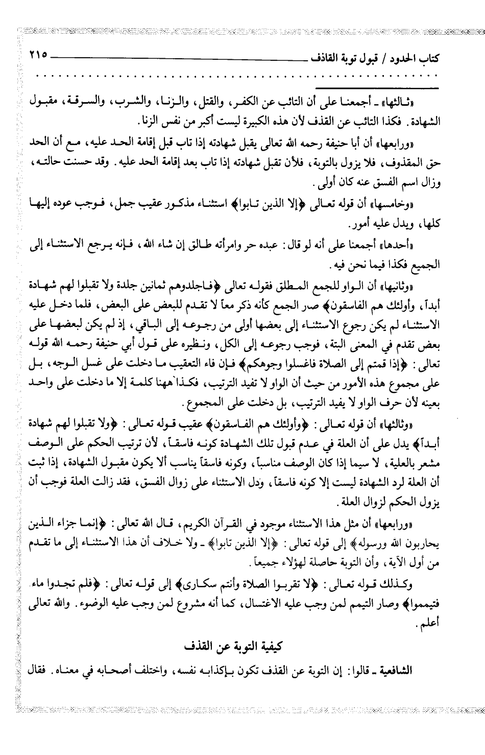 (وثالثها) أجمعنا على أن التائب عن الكفر، والقتل، والزنا، والشرب، والسرقة، مقبول الشهادة. فكذا التائب عن القذف لأن هذه الكبيرة ليست أكبر من نفس الزنا. (ورابعها) أن ابا حنيفة رحمه الله تعالى يقبل شهادته إذا تاب قبل إقامة الحد عليه، مع أن الحد حق المقذوف، فلا يزول بالتوبة، فلأن تقبل شهادته إذا تاب بعد إقامة الحد عليه. وقد حسنت حالته، وزال اسم الفسق عنه كان أولى.