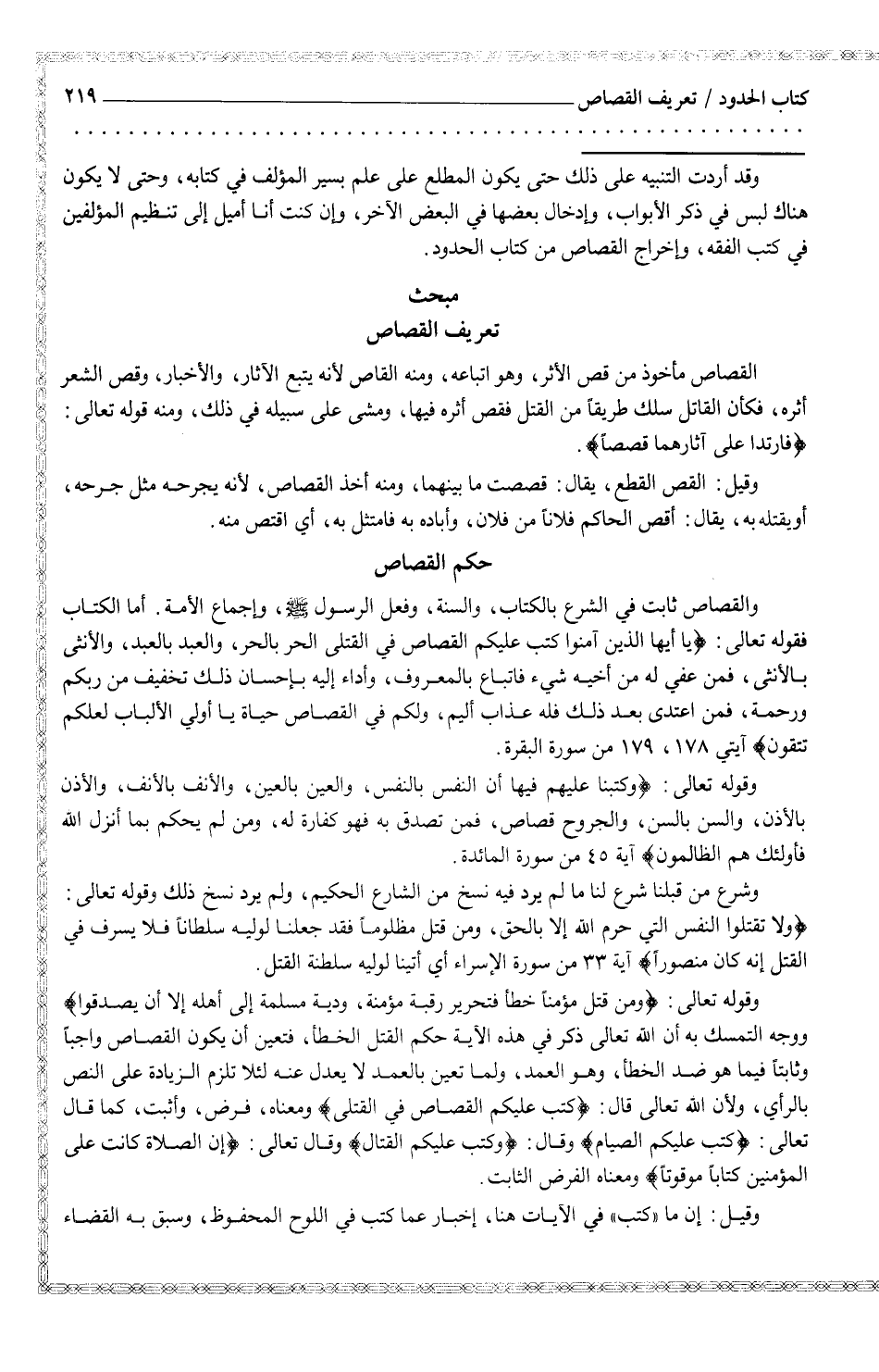وقد أردت التنبيه على ذلك حتى يكون المطلع على علم بسير المؤلف في كتابه، وحتى لا يكون هناك لبس في ذكر الأبواب، وإدخال بعضها في البعض الآخر، وإن كنت أنا أميل الى تنظيم المؤلفين في كتب الفقه، وإخراج القصاص من كتاب الحدود.
