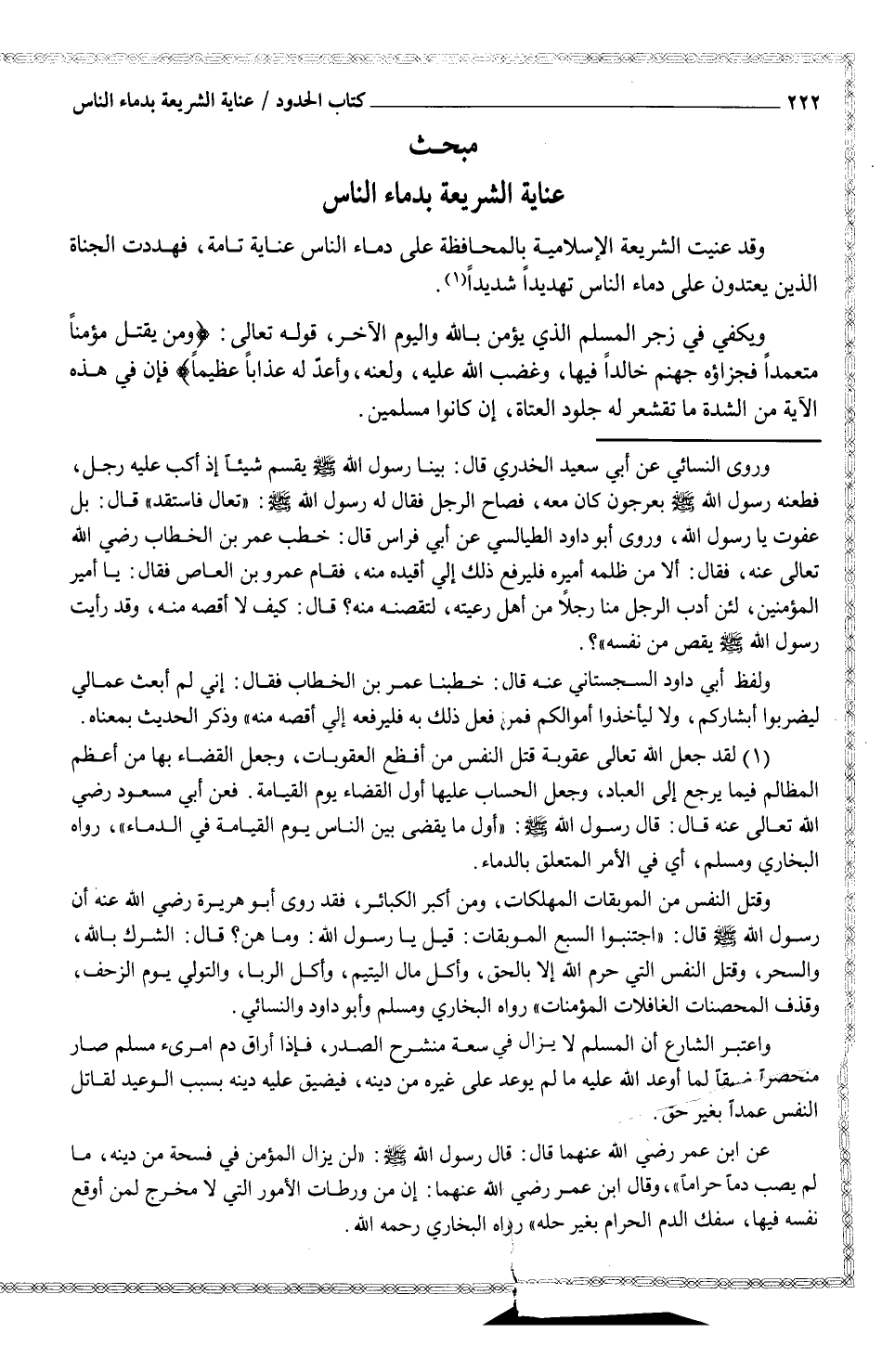 -وقد عنيت الشرعة الإسلامية بالمحافظة على دماء الناس عناية تامة، فددت الجناة الذين يعتدون على دماء الناس تهديداً شديداً (¬1)