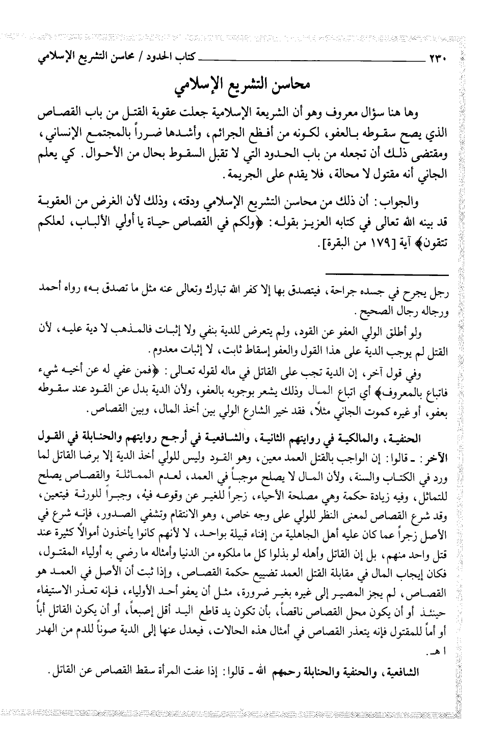 -وها هنا سؤال معروف وهو أن الشريعقة الإسلامية جعلت عقوبة القتل من باب القصاص الذي يصح سقوطه بالعفو، لكونه من أفظع الجرائم، وأشدها ضرراً بالمجتمع الإنساني، ومقتضى ذلك أن تجعله من باب الحدود التي لا تقبل السقوط بحال من الأحوال. كي يعلم الجاني أنه مقتول لا محالة، فلا يقدم على الجريمة.