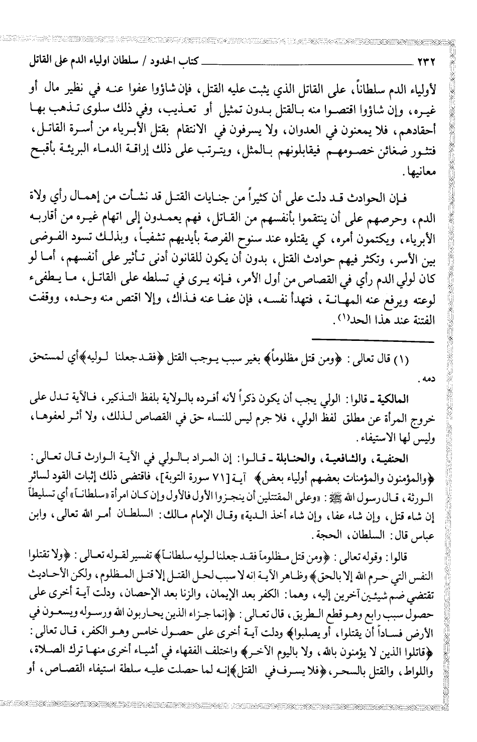 الحنيفية، والمالكية، والحنابلة - قالوا: إن المراد بالولي في الآية الوارث قال تعالى: {والمؤمنون والمؤمنات بعضهم أوليا بعض} آية [71 سورة التوبة] ، فاقتضى ذلك إثبا القود لسائر الورثة، قال رسول الله صلى الله عليه وسلم: (وعلى المقتتلين أن ينجزوا الول فلأول وإن كان امرأة (سلطاناً) أي تسليطاً إن شاء قتل، وإن شاء عفا، وإن شاء اخذ الدية) وقال الإمام مالك: السلطان أمر الله تعالى، ابن عباس قال: السلطان، الحجة.