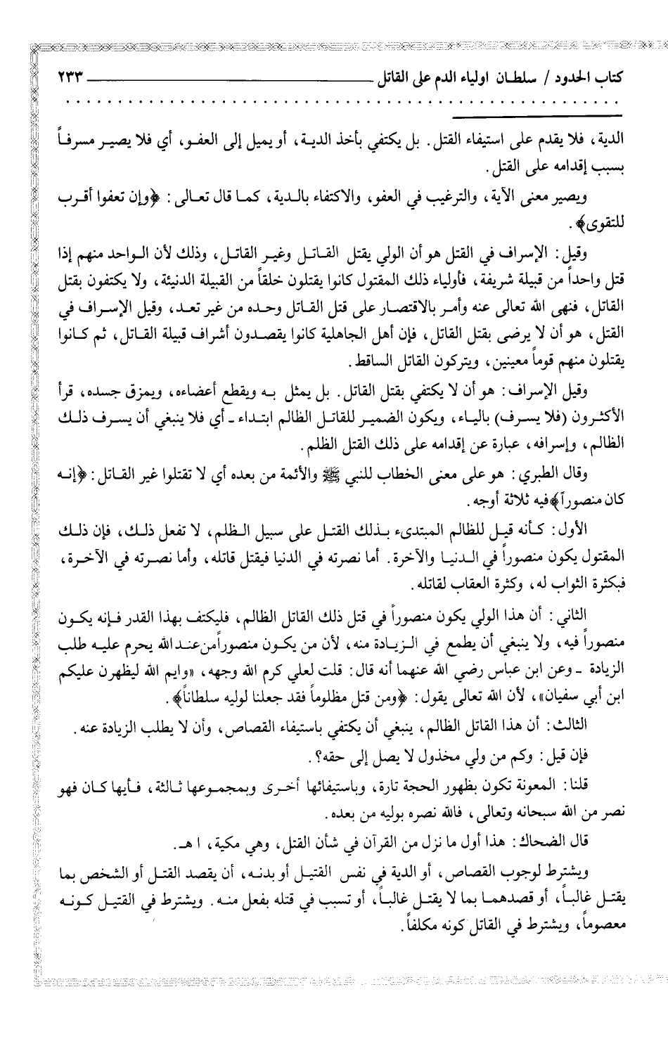 الدية، فلا يقدم على استيفاء القتل. بلك يكتفي بأخذ الدية، أو يميل إلى العفو، أي فلا يصير مسرفاً بسبب إقدامه على القتل.