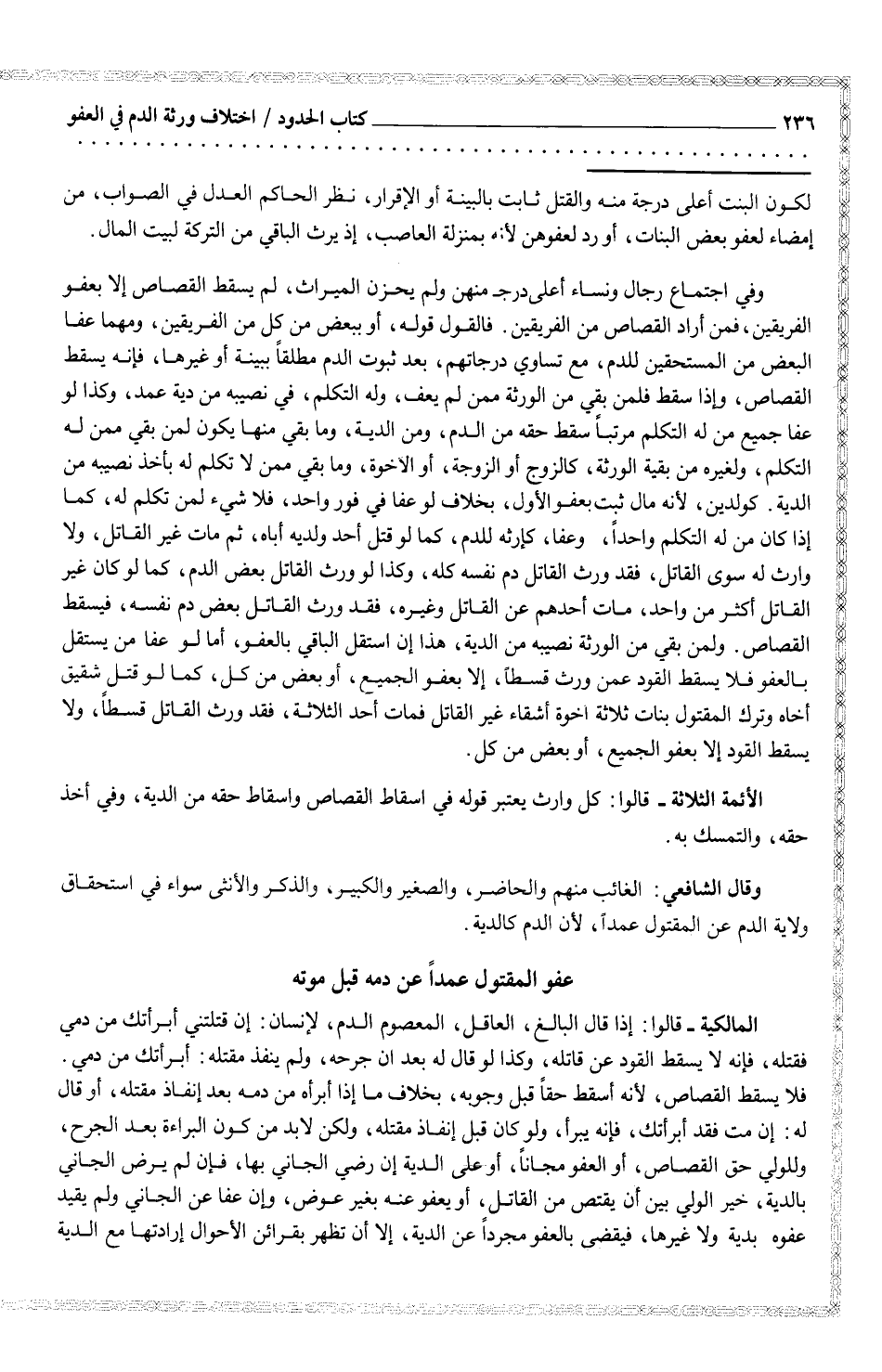 الأئمة الثلاثة قاولا: كل وارث يعتبر قوله في اسقاط القصاص وغسقاط حقه من الدية، وفي أخذ حقه، والتمسك به.