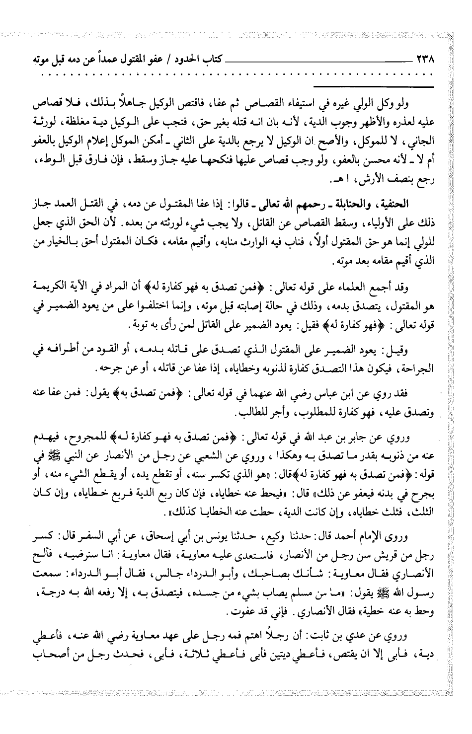 وروي عن جابر بن عبد الله في قوله تعالى: {فمن تصدق به فهو كفارة له} للمجروح، فيهدم عنه من ذنوبه بقدر ما تصدق به وهكذا، وروي عن الشعبي عن رجل من النصار عن النبي صلى الله عليه وسلم في قوله: {فمن تصدق به فهو كفارة له} قالك (هو الذي تكسر سنه، أو تقطع يده، أو يقطع الشيء منه، أو بجرح في بدنه فيعفو عن ذلك) قال: (فيحط عنه خطاياه، فإن كان ربع الدية فربع خطاياه، وإن كان الثلث، فثلث خطاياه، وإن كانت الدية، حطت عنه الخطايا كذلك) .