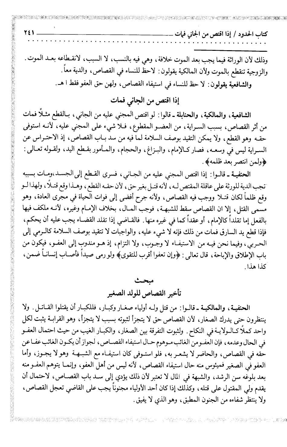 الحنفية، والمالكية قالوا: من قتل وله أولياء صغار وكبار، فللكبار أن يقتلوا القاتل. ولا ينتظرون حتى يدرك الصغار، لأن القصاص حق لا يتجزأ لثبوته بسبب لا يتجزأ، وهو القرابة يثبت لكل واحد كملاً كالولاية في النكاح. ولثبوت التفرقة بين الصغار، والكبار الغيب من حيث احتمال العفو في الحال وعدمه، فإن العفو من الغائب موهوم حال استيفاء القصاص، لجواز أن يكون الغائب عفا عن حقه في القصاص، والحاضر لا يشعر به، فلو استوفى كان استيفاء مع الشبهة وهو لا يجوز، وأما العفو في الصغير فميئوس منه حال استيفاء القصاص، لأنه ليس من أهل العفو، وإنما يتوهم العفو منه بعد بلوغه سن الرشد، والشبهة في المال لا تعتبر لأن ذلك يؤدي إلى سد باب القصاص، لاحتمال أن يقدم ولي المقتول على قتله، وكذلك إذا كان احد الاولياء مجنوناً يجب على القاضي تعجل القصاص، ولا ينتظر شفاءه من الجنون المطبع، وهو الذي لا يفيق.