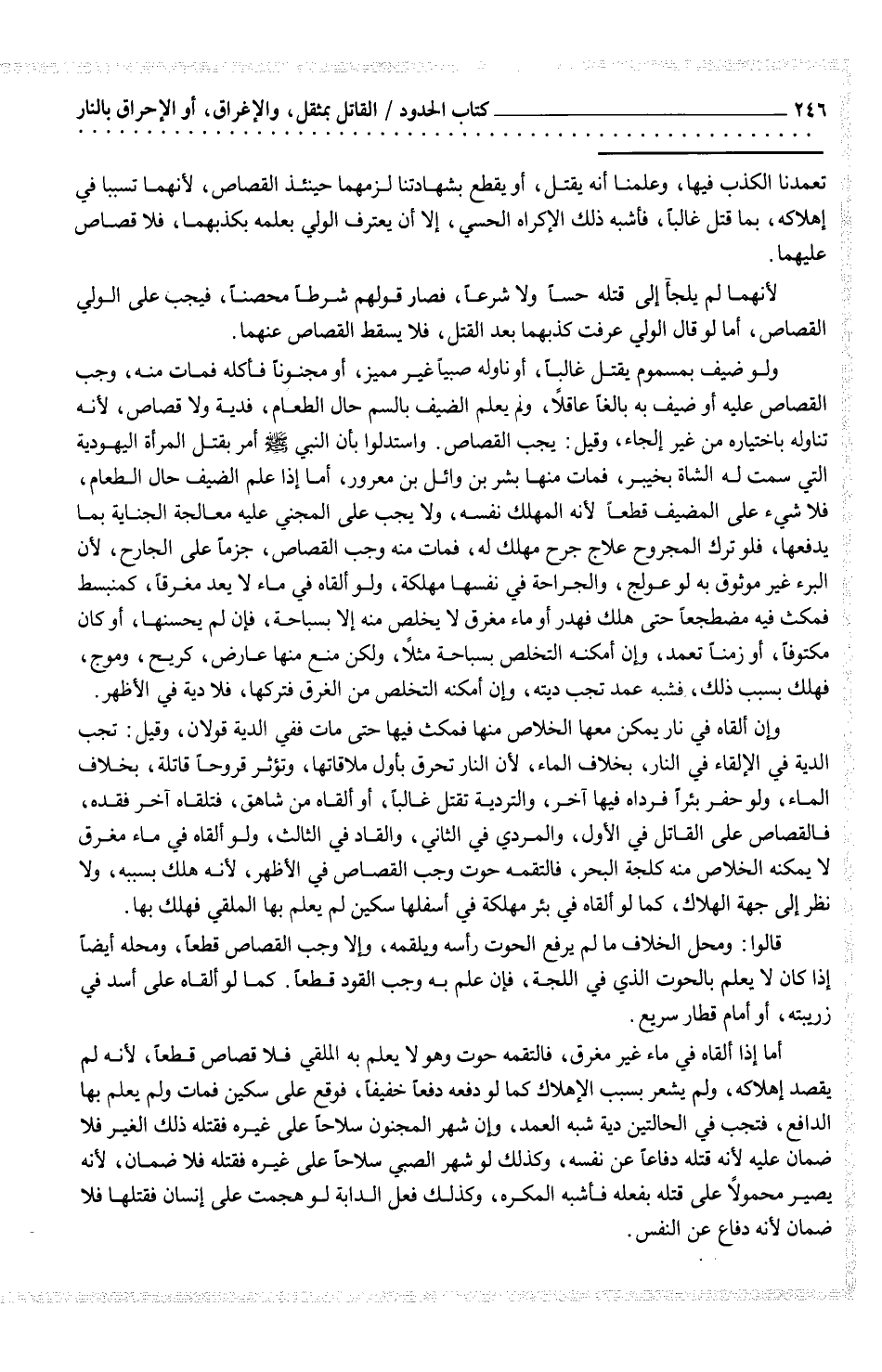 ولو ضيف بمسموم يقتل غالباً، أو ناوله صبياً غير مميز، أو مجنوناً فأكله فمات منه، وجب القصاص عليه أو ضيف به بالغاً عاقلاً، ولم يعلم الضيف بالسم حال الطعام، فدية ولا قصاص، لأنه تناوله باختياره من غير إلجاء، وقيل: يجب القصاص. واستدلوا بأن النبي صلى الله عليه وسلم امر بقتل المرأة اليهودية التي سمت له الشاة بخيبر، فمات منها بشر بن وائل بن معرور، أما إذا علم الضيف حال الطعام، فلا شيء على المضيف قطعاً لأنه المهلك نفسه، ولا يجب على المجني عليه معالجة الجناية بما يدفعها، فلو ترك المجروح علاج جرح مهلك له، فمات منه وجب القصاص، جزمماً على الجارح، لأن البرء غير موثوق به لو عولج، والجراحة في نفسها مهلكة، ولو ألقاه في ماء لا يعد مغرقاً كمنبسط فمكث فيه مضطجعاً حتى هلك فهدر أو ماء مغرق لا يخلص منه إلا بسباحة، فإن لم يحسنها، أو كان مكتوفاً، أو زمناً تعمد، وإن أمكنه التخلص بسباحة مثلاً، ولكن منع منها عارض، كريح، وموج، فهلك بسبب ذلك، فشبه عمد تجب دينه، وإن أمكنه التخلص بسباحة مثلاً، ولكن منع منها عارض، كريح، وموج، فهلك بسبب ذلك، فشبه عمد تجب دينه، وإن أمكنه التخلص من الغرق فتركها، فلا دية في الأظهر.
