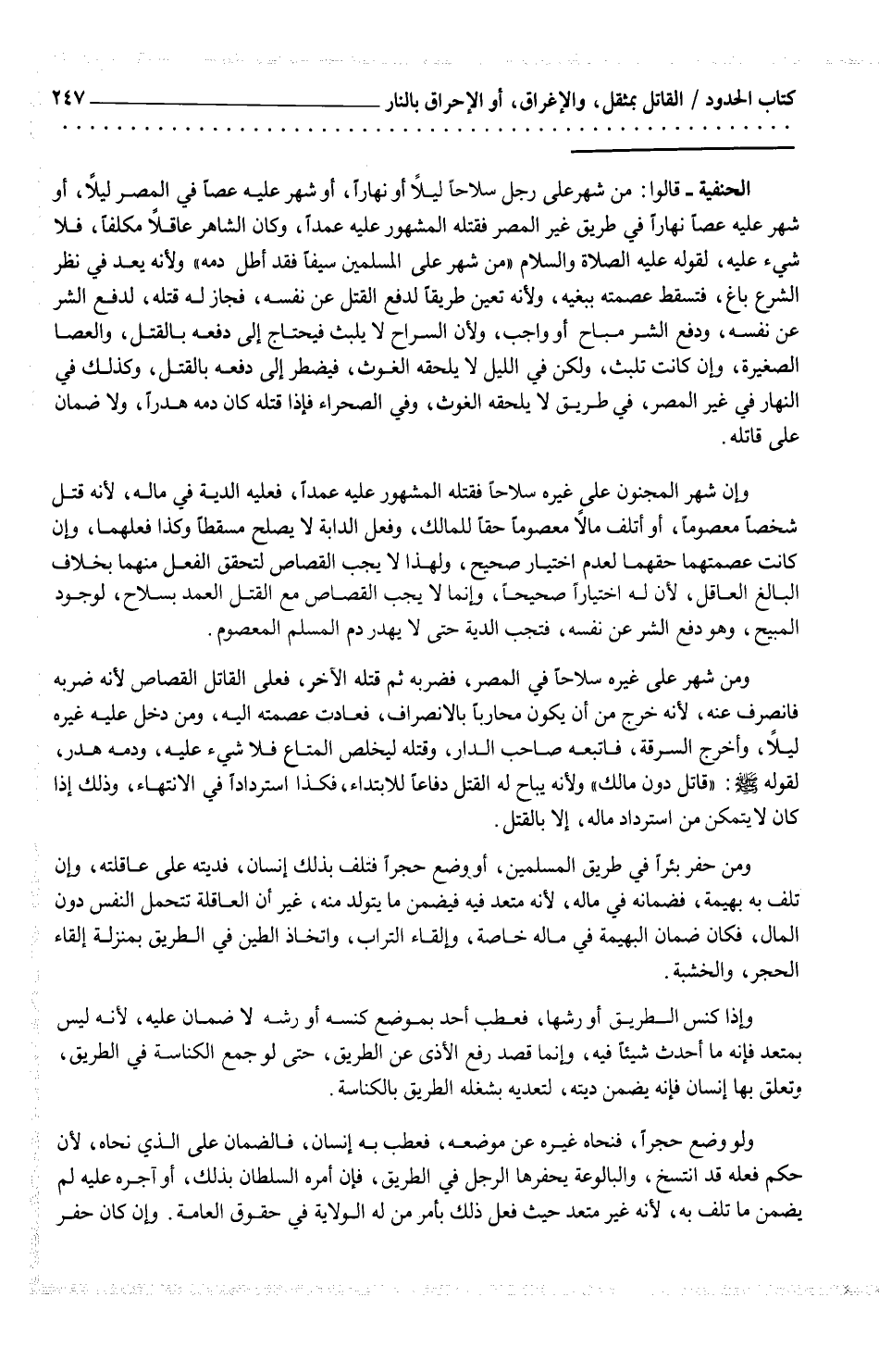الحنفية قالوا: من شهر على رجل سلاحاً ليلاً أو نهاراً، أو شهر عليه عصاً في المصر ليلاً، أو شهر عليه عصاً نهاراً في طريق غير المصر فتله المشهور عليه عمداً، وكان الشاهر عاقلاً مكلفاً، فلا شيء عليهن لقوله عليه الصلاة والسلام (من شهر على المسلمين سيفاً فقد أطل دمه) ولأنه يعد في نظر الشرع باغ، فتسقط عصمته ببغيه، ولأنه تعين طريقاً لدفع القتل عن نفسهن فجاز له قتله، لدفع الشر عن نفسه، وجعف الشر مباح أو واجب، ولأن السراح لا يلبث فيحتاج إلى دفعه بالقتل، والعصا الصغيرة، وإن كانت تلبث، وكن في الليل لا يلحقه الغوث، فيضطر إلى جفعه بالقتل، وكذلك في النهار في غير المصرن في طريق لا يلحقه الغوث، وفي الصحراء فإذا قتله كان دمه هدراً، ولا ضمان على قاتله.