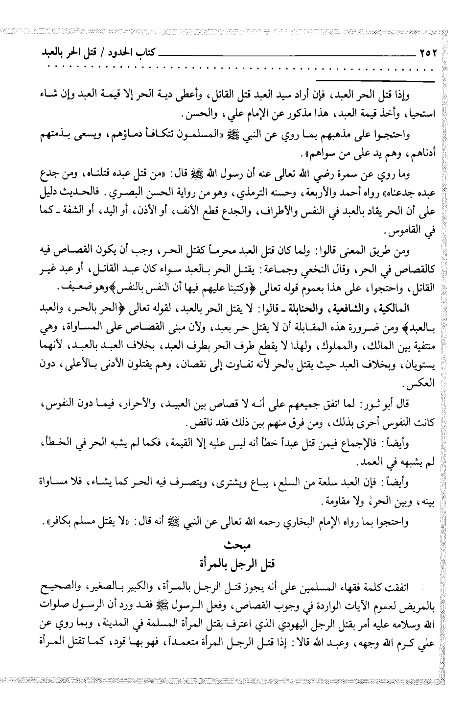 وإذا قتل الحر العبد، فإن أراد سيد العبد قتل القاتل، وأعطى دية الحر إلا قيمة العبد وإن شاء استحيا، واخذ قيمة العبد، هذا مذكور عن الإمام علي، والحسن.