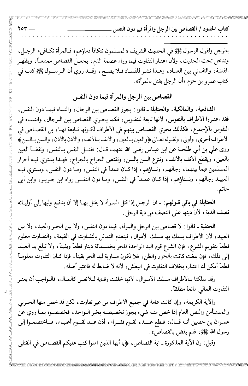 بالرجل ولقول الرسول صلى الله عليه وسلم في الحديث الشريف (المسلمون تتكافأ دماؤهم، فالمرأة تكافىء الرجل، وتدخل تحت الحديث، ولات اعتبار التفاوت فميا وراء عصمة الدم، يجعل القصاص ممتنعاً، ويظهر الفتنة، والتفاني بين العباد، وهذا نشر للفساد فلا يصح، وقد روي أن الرسول صلى الله عليه وسلم كتب في كتاب عمرو بن حزم (أن الرجل يقتل بالمرأة) .