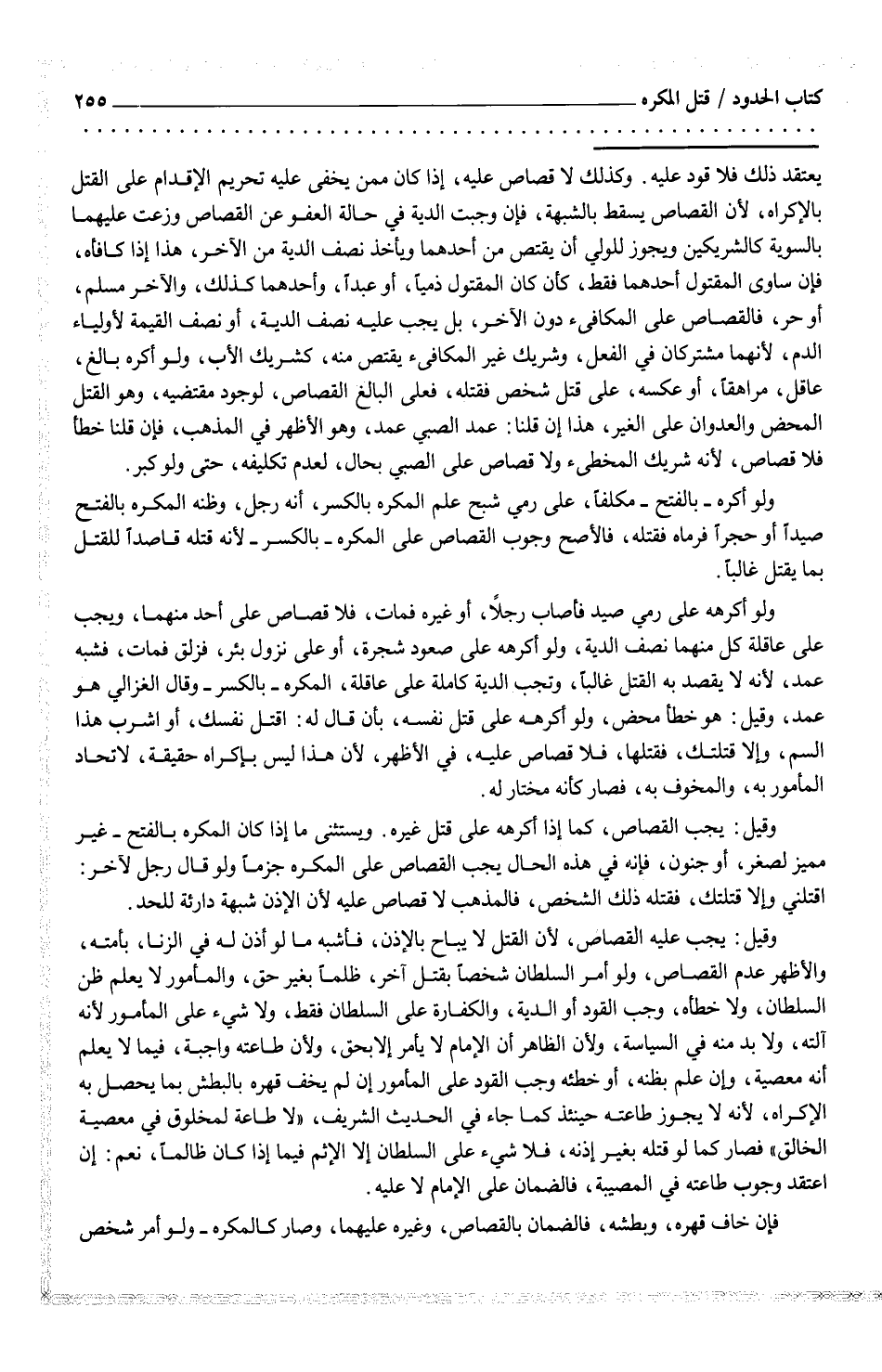 يعقد ذلك فلا قود عليه. وكذلك لا قصاص عليه، إذا كان ممن يخفى عليه تحريم الإقدام نعلى القتل بالإكراه، لأن القصاص يسقط بالشبهة، فإن وجبت الدية في حالة العفو عن القصاص وزعت عليهما بالسوية كالشريكين ويجوز للولي أن يقتص من أحدهما ويأخذ نصف الدية من الآخر، هذا إذا كافأه، فإن ساوى المقتول أحدهما فقط، كأن كان المقتول ذمياً، أو عبداً، واحدهما كذلك، والآخر مسلم، أو حر، فالقصاص على المكافىء دون الآخر، بل يجبعليه نصف الدية، أو نصف القيمة لأولياء الدم، لأنهما مشتركان في الفعل، وشريك غير المطافىء يقتص منه، كشريك الأب، ولو أكره بالغ، عاقل، مراهقاً، أو عكسه، على قتل شخص فقتله، فعلى البالغ القصاص، لوجود مقتضيه، وهو القتل المحض والعدوان على الغير، هذا إن قلنا: عمد الصبي عمد، وهو الأظهر في المذهب، فإن قلنا خطأ فلا قصاص، لأنه شريك المخطىء ولا قصاص على الصبي بحال، لعدم تكليفه، حتى ولو كبر.