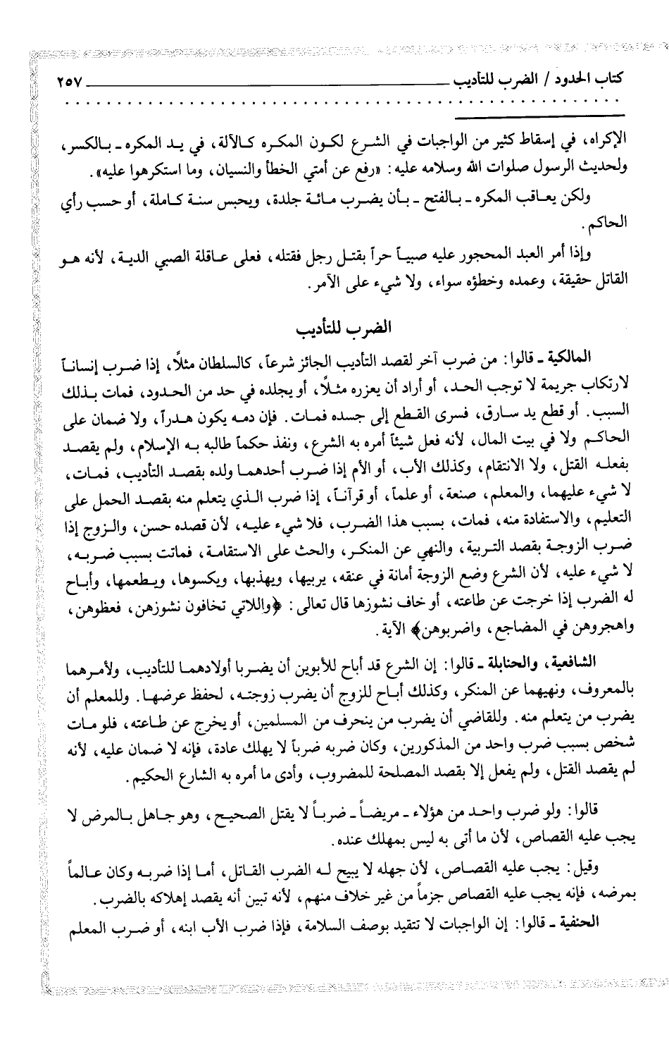 المالكية قالوا: من ضرب آخر لقصد التأديب الجائز شرعاً، كالسلطان مثلاً، إذا ضرب إنساناً لارتكاب جريمة لا توجب الحد، أو أراد أن يعزره مثلاً، أو يجله في حد من الحدود، فمات بذلك السبب. أو قطع يد سارق، فسرع القطع إلى جسده فمات. فإن دمه يكون هدراً، ولا ضمان على الحاكم ولا في بيت آلما، لأنه فعل شيئاً آمره به الشرع، ونفذ حكماً طالبه به الإسلام، ولم يقصد بفعله القتل، ولا الانتقام، وكذلك الأب، أو آلم إذا ضرب أحدهما ولده بقصد التأديب، فمات، لا شيء عليهما، والمعلم، صنعة، أو علماً، أو قرآناً، إذا ضرب الذي يتعلم منه بقصد الحمل على التعليم، والاستفادة منه، فمات، بسبب هذا الضرب الذي يتعلم منه بقصد الحمل على ضرب الزوجة بقصد التربية، والنهي عن المنكر، والحث على الاستقامة، فماتت بسبب ضربه، لا شيء عليه، لأن الشرع وضع الزوجة أمانة في عنقه، يربيها، ويهذبها، ويكسوها، ويطعماه، أباح له الضرب إذا خرجت عن طاعته، أو خاف نشوزها قال تعالى: {واللاتي تخافون نشوزهن، فعظوهن، واهجروهن في المضاجع، واضربوهن} الآية.