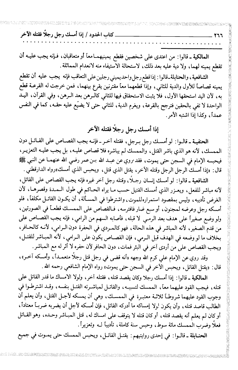 الحنفية قالوا: لو أمسك رجل برجل، فقتله آخر فإنه يجب القصاص على القاتل دون الممسك، لأنه هو الذي باشر القتل، والممسك لم يباشره فلا قصاص عليه، بل يجب عليه التعزير، فيحبسه الإمام في السجن حتى يموت، فقد روي عن عبد الله بن عمر رضي الله عنهما عن النبي صلى الله عليه وسلم قال: (إذا أمسك الرجل الرجل وقتله الآخر، يقتل الذي قتل، ويحبس الذي أمسك) رواه الدارقطني. الشافعية قالوا: لو أمسك إنسان رجلاً، وقتله رجل آخر غيره فإنه يجب القصاص على القاتل، لأنه مباشر للفعل، ويعزر الذي أمسك القتيل حسب ما يراه الحاكم في طول المدة وقصرها، لأن الغرض تأديبه، وليس بمقصود استمراره للموت، واشترطوا في المسألة، أن يكون القاتل مكلفاً، فلو أمسكه رجل وعرضه لمجنون، أو سبع ضار فافترسه، فالقصاص على الممسك قطعاً في الصورتين، ولو وضع صغيراً على هدف بعد الرمي لا قبله، فاصابه السهم من الرامي، لأنه المباشر للقتل، ويجب القصاص على من أردى آخر في البئر فمات، دون الحافر لأن حفره لا أثر له مع المباشر.