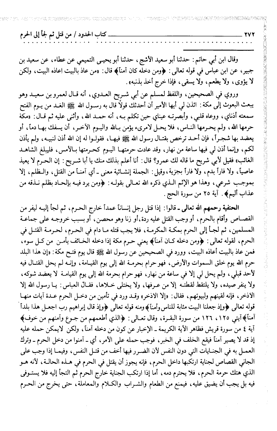 الحنفية رحمهم الله تعالى قالوا: إذا قتل رجل إنساناً عمداً خارج الحرم، ثم لجأ إليه ليفر من القصاص وأقام بالحرم، أو وجب القتل عليه ردة، أو زنا وهو محصن، أو بسبب خروجه على جماعة المسلمين، ثم لجأ إلى الحرم بمكة المكرمة، فلا يجب قتله ما دام في الحرم، لحرمة القتل في الحرم، لقول تعالى: {ومن دخله كان آمنا} يعنى حرم مكة إذا دخله الخائف يأمن من كل سوء، فمن عاذ بالبيت أعاذه البيت، وورد في الصحيحين عن رسول الله صلى الله عليه وسلم قال يوم فتح مكة: (إن هذا البلد حرم الله يوم خلق السموات والأرض، فهو حرام بحرمة الله إلى يوم القيامة، وأنه لم يحل القتل فيه لأحد قبلي، ولم يحل لي إلا في ساعة من نهار، فهو حرام بحرمة الله إلى يوم القيامة لا يعضد شوكه، ولا ينفر صيده، ولا يلتقط لقطته إلا من عرفها، ولا يختلى خلاها، فقال العباس: يا رسول الله إلا الأذخر، فإنه لقينهم ولبيوتهم، فقال: (إلا الادخر) وقد ورد في تأمين من دخل الحرم عدة آيات منها قوله تعالى {واذ جعلنا البيت مثابة للناس وأمناً} ومنه قوله تعالى {واذ قال إبراهيم رب اجعل هذا بلداً آمناً} آيتي 125، 126 من سور البقرة، وقال تعالى: {الذي أطعمهم من جوع وآمنهم من خوف} آية 4 من سورة قريش فظاهر الآية الكريمة الإخبار عن كون من دخله آمناً، ولكن لا يمكن حمله عليه إذ قد لا يصير آمناً فيقع الخلف في الخبر، فودب حمله على الأمر، أي آمنوا من دخل الحرم وترك العمل به في الجنايات التي دون النفس لأن الضرر فيها أخف من قتل النفس، وفيما إذا وجب على الجاني القصاص لجناية ارتكبها داخل الحرم، فإنه يجوز أن يقتل في الحرم في هذه الحالة، لأنه هو الذي هتك حرمة الحرم، فلا يحترم دمه، أما إذا ارتكب الجناية خارج الحرم ثم التجأ إليه فلا يستوفي فيه بل يجب أن يضيق عليه، فيمنع من
