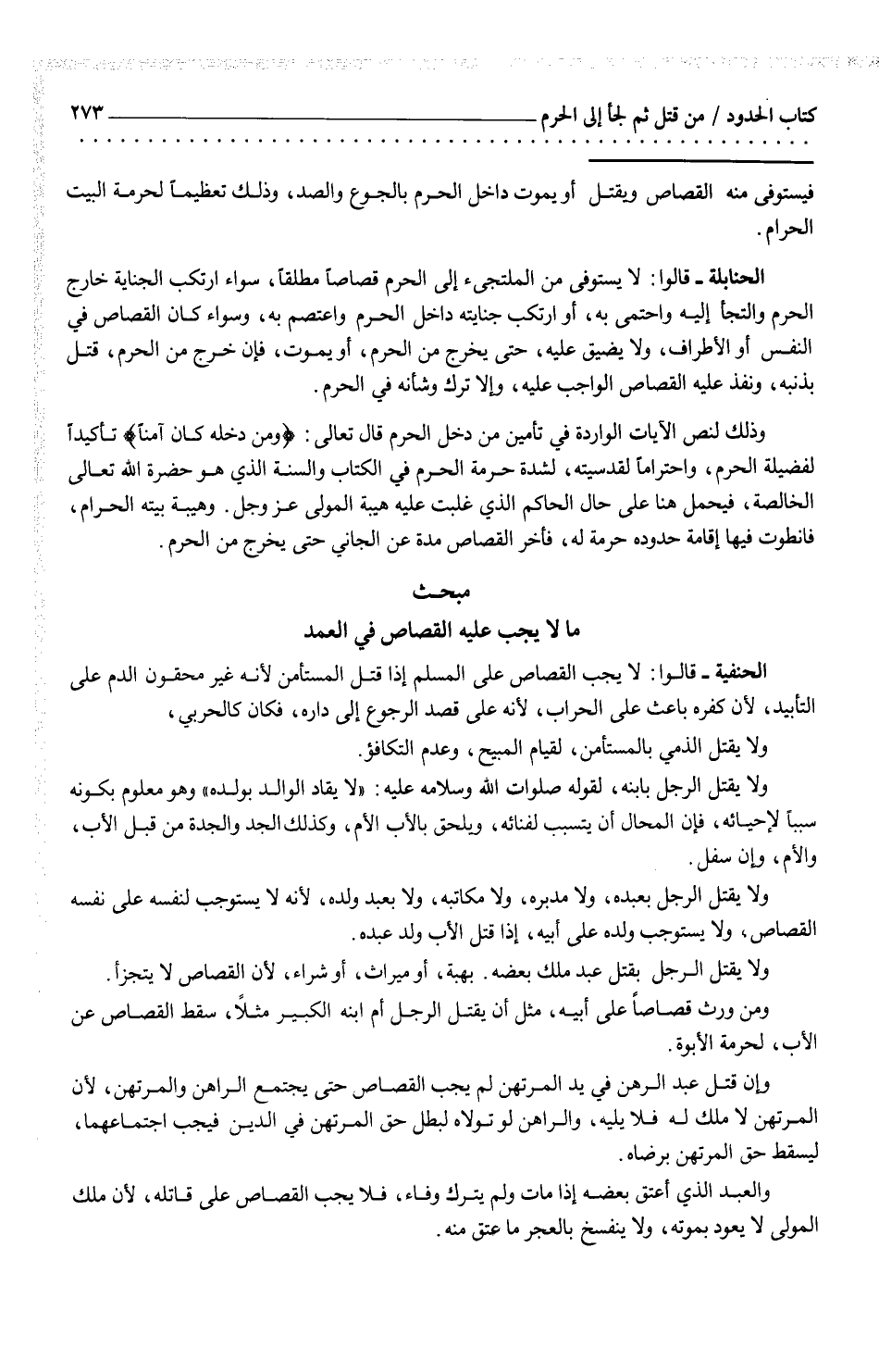 فيستوفى منه القصاص ويقتل أو يموت داخل الحرم بالجوع والصد، وذلك تعظيماً لحرمة البيت الحرام. الحنابلة قالوا: لا يستوفى من الملتجىء إلى الحرم قصاصاً مطلقاً، سواء ارتكب الجناية خارج الحرم والتجأ إليه واحتمى به، أو ارتكب جنايته داخل الحرم واعتصم به، وسواء كان القصاص في النفس أو الأطراف، ولا يضيق عليه، حتى يخرج من الحرم، أو يموت، فإن خرج من الحرم، قتل بذنبه، ونفذ عليه القصاص الواجب عليه، وإلا ترك وشأنه في الحرم. وذلك لنص الآيات الواردة في في تأمين من دخل الحرم قال تعالى: {ومن دخله كان آمناً} تأكيداً لفضيلة الحرم، واحتراماً لقدسيته، لشدة حرمة الحرم في الكتاب والسنة الذي هو حضرة الله تعالى الخالصة، فيحمل هنا على حال الحاكم الذي غلبت عليه هيبة المولى عز وجل. وهيبة بيته الحرام، فانطوت فيها إقامة حدوده حرمة له، فأخر القصاص مدة عن الجاني حتى يخرج من الحرم.