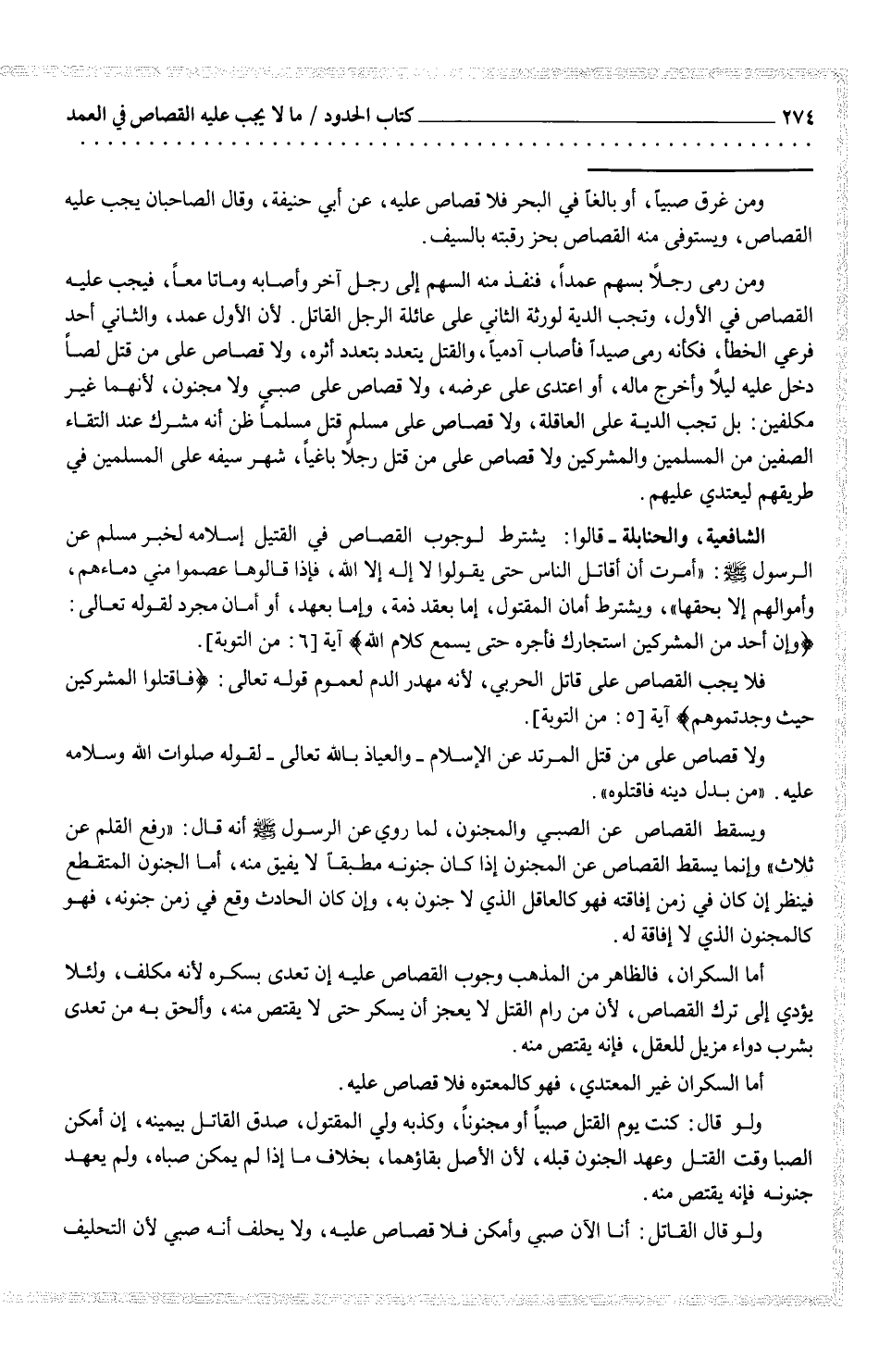 ومن رمى رجلاً بسهم عمداً، فنفذ منه السهم إلى رجل آخر وأصابه وماتا معاً، فيجب عليه القصاص في الأول، وتجب الدية لورثة الثاني على عائلة الرجل القاتل. لأن الول عمد، والثاني احد فرعي الخطأ، فكأنه رمى صيداً فأصاب آدمياً، والقتل يتعدد بتعدد أثره، ولا قصاص على من قتل لصاً دخل عليه ليلاً وأخرج ماله، أو اعتدى على عرضه، ولا قصاص على صبي ولا مجنون، لانهما غير مكلفين: يجب الدية على العاقلة، ولا قصاص على مسلم قتل مسلماً ظن أنه مشرك عند التقاء الصغين من المسلمين والمشركين ولا قصاص على من قتل رجلاً باغياً، شهر سيفه على المسلمين في طريقهم ليعتدي عليهم.