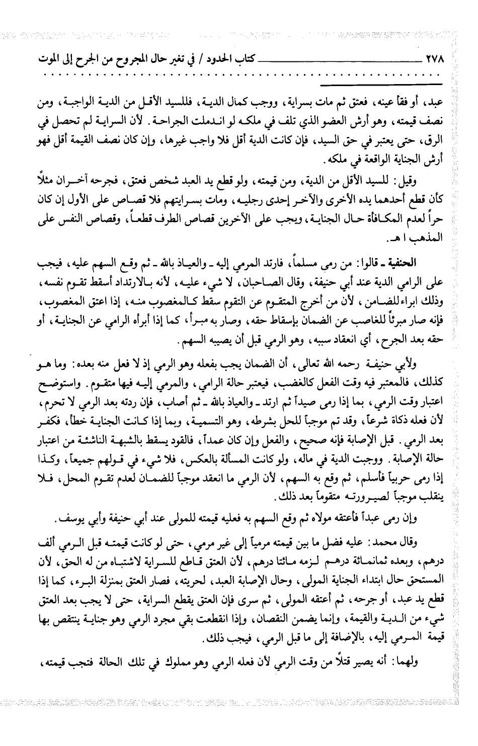الحنفية: من رمى مسلماً، فارتد المرمي إليه والعياذ بالله ثم وقع السهم عليه، فيجب على الرامي الدية عند أبي حنيفة، وقال الصاحبان، لا شيء عليه، لأنه بالارتداد أسقط تقوم نفسه، وذلك ابراء للضامن، لأن من أخرج المتقوم عن التقوم سقط كالمغصوب منه، إذا اعتق المغصوب، فإنه صار مبرئاً للغاصب عن الضمان بإسقاط حقه، وصار به مبرأ، كما إذا أبرأه الرامي عن الجناية، أو حقه بعد الجرح، أي انعقاد سببه، وهو الرمي قبل أن يصيبه السهم.