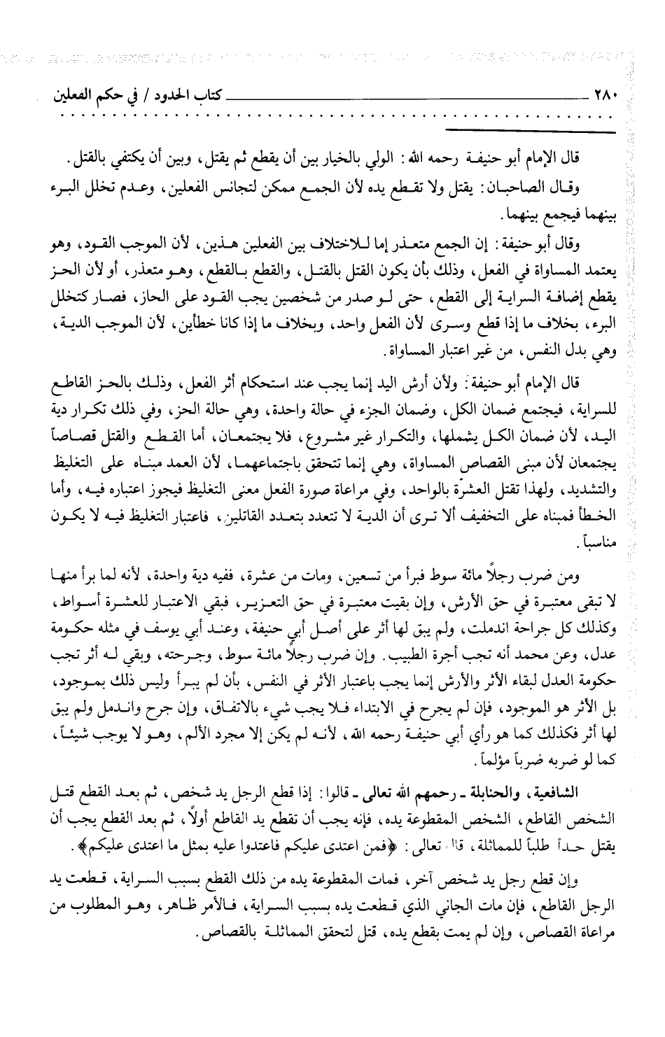 الشافعية، والحنابلة رحمهم الله - قالوا: إذا قطع الرجل يد شخص، ثم بعد القطع قتل الشخص القاطع، الشخص المقطوعة يده، فإنه يجب أن تقطع يد القاطع اولاً، ثم بعد القطع يجب أن يقتل حداً طلباً للمماثلة، قال تعالى: {فمن اعتدى عليكم فاعتدوا عليه بمثل ما اعتدى عليكم} .