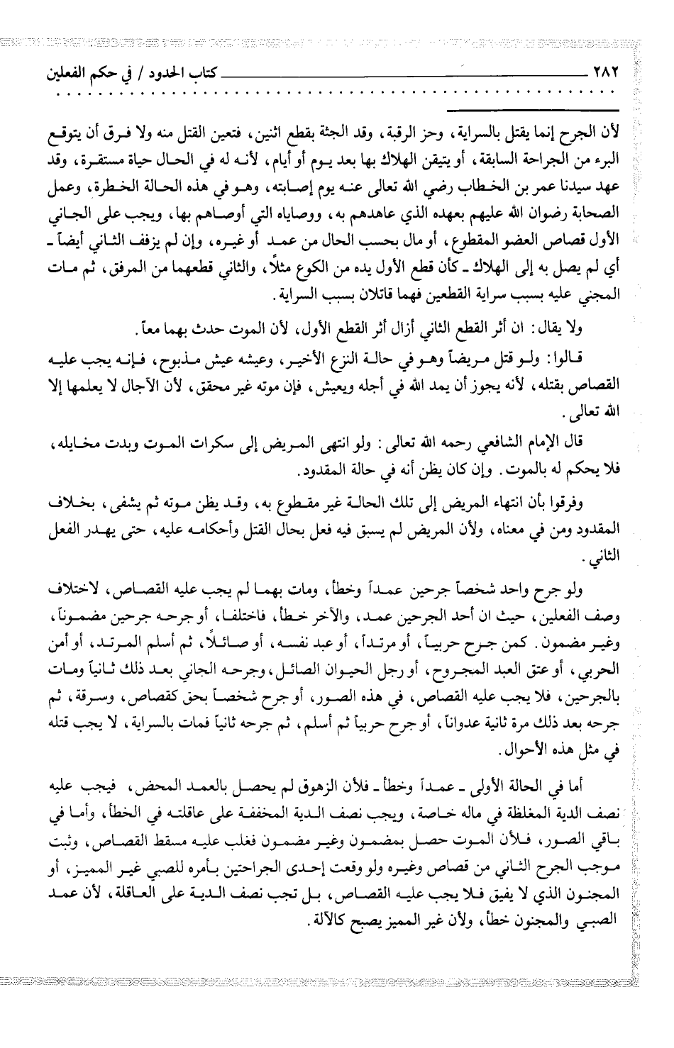 لأن الجرح إنما يقتل بالسراية، وحز الرقبة، وقد الجثة بقعط اثنينن فتعين القتل منه ولا فرق أن يتوقع البرء من الجراحة السابقة، أو يتيقين الهلاك بها بعد يوم أو أيام، أيام، لأنه له في الحال حياة مستقرة، وقد عهد سيدنا عمر بن الخطاب رضي الله تعالى عنه يوم إصابته، وهو في هذه الحالة الخطرة، وعمل الصحابة رضوان الله عليهم بعده الذي عاهدهم به، ووصاياه التي أوصاهم بها، ويجب على الجاني الأول قصاص العضو المقطوع، أو مال بحسب الحال من عمد أو غيره، وإن لم يزفف الثاني أيضاً أي لم يصل به إلى الهلاك كأن قطع الأول يده من الكوع مثلاً، والثاني قطعهما من المرفق، ثم مات المجني عليه بسبب سراية القطعين فهما قاتلان بسبب السراية.