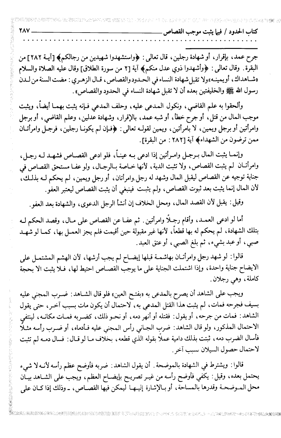 جرح عمد، بإقرار أو شهادة رجلين، قال تعالى: {واستشهدوا شهيدين من رجالكم} [آية 282] من البقرة. وقال تعالى: {وأشهدوا ذوي عدل منكم} آية [2 من سورة الطلاق] وقال عليه اصلاة والسلام (شاهداك، أو يمينه) ولا تقبل شهادة النساء في الحدود والقصاص، قال الزهري: مضت السنة من لدن رسول الله صلى الله عليه وسلم والخليفتين بعده أن لا تقبل شهداة النساء في الحدود والقصاص) .