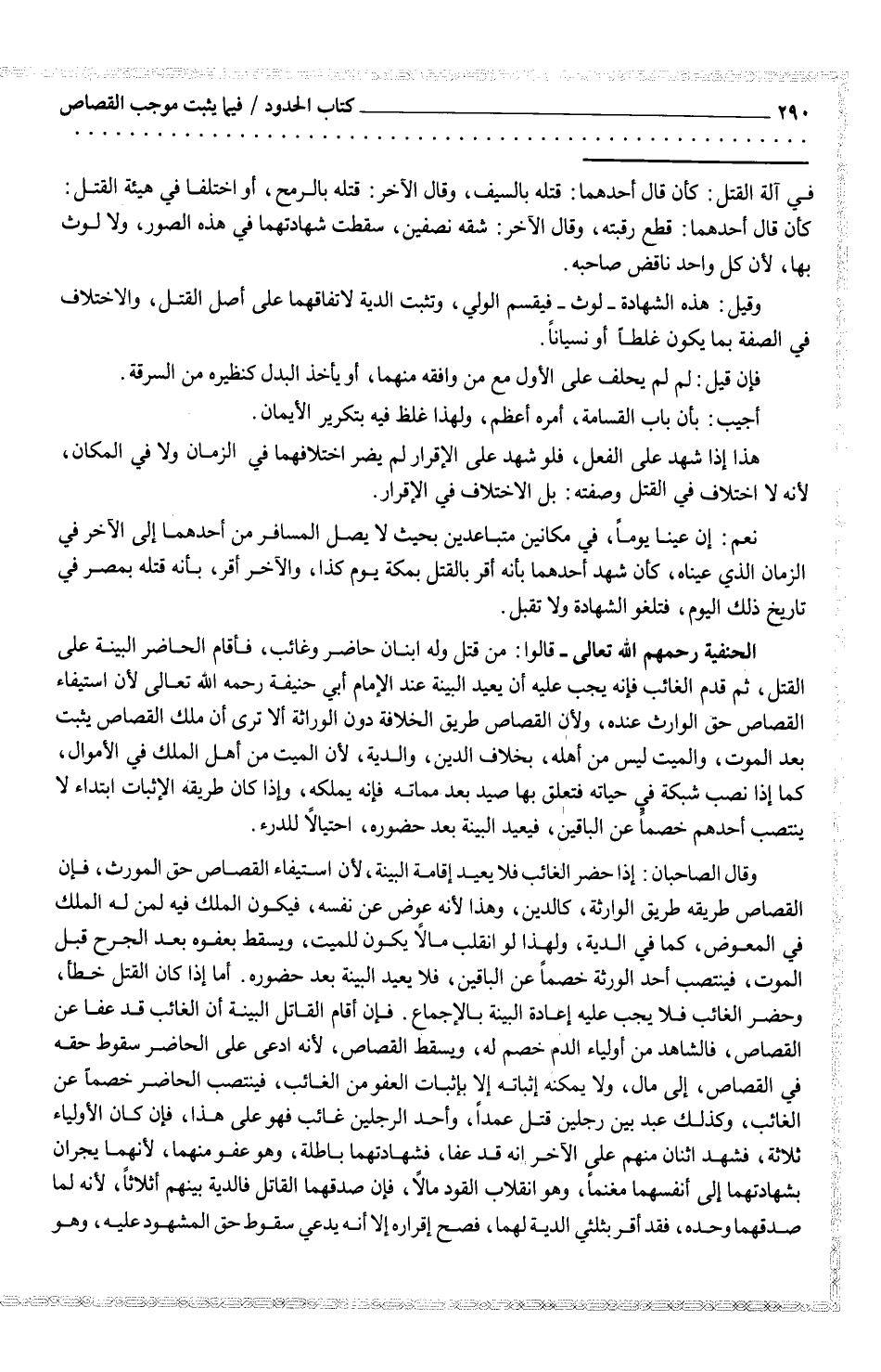 الحنفية رحمهم الله تعالى - قالوا: من قتل وله ابنان حاضر وغائب، فأقام الحاضر البينة على القتل، ثم قدم الغائب فإنه يجب عليه أن يعيد البينة عند الإمام أبي حنيفة رحمه الله تعالى لأن استيفاء القصاص حق الوارث عنهده، ولأن القصاص طريق الخلافة دون الوراثة ألا ترى أن ملك القصاص يثبت بعد الموت، والميت ليس من أهله، بخلاف الدين، والدية، لأن الميت من أهل الملك في الأموال، كما إذا نصب شبكة في حياته فتعلق بها صيد بعد ممانه فإنه يملكه، وإذا كان طريقه الإثبات ابتداء لا ينتصب أحدهما خصماً عن الباقين، فيعيد البينة بعد حضوره، احتيالاً للدرء.