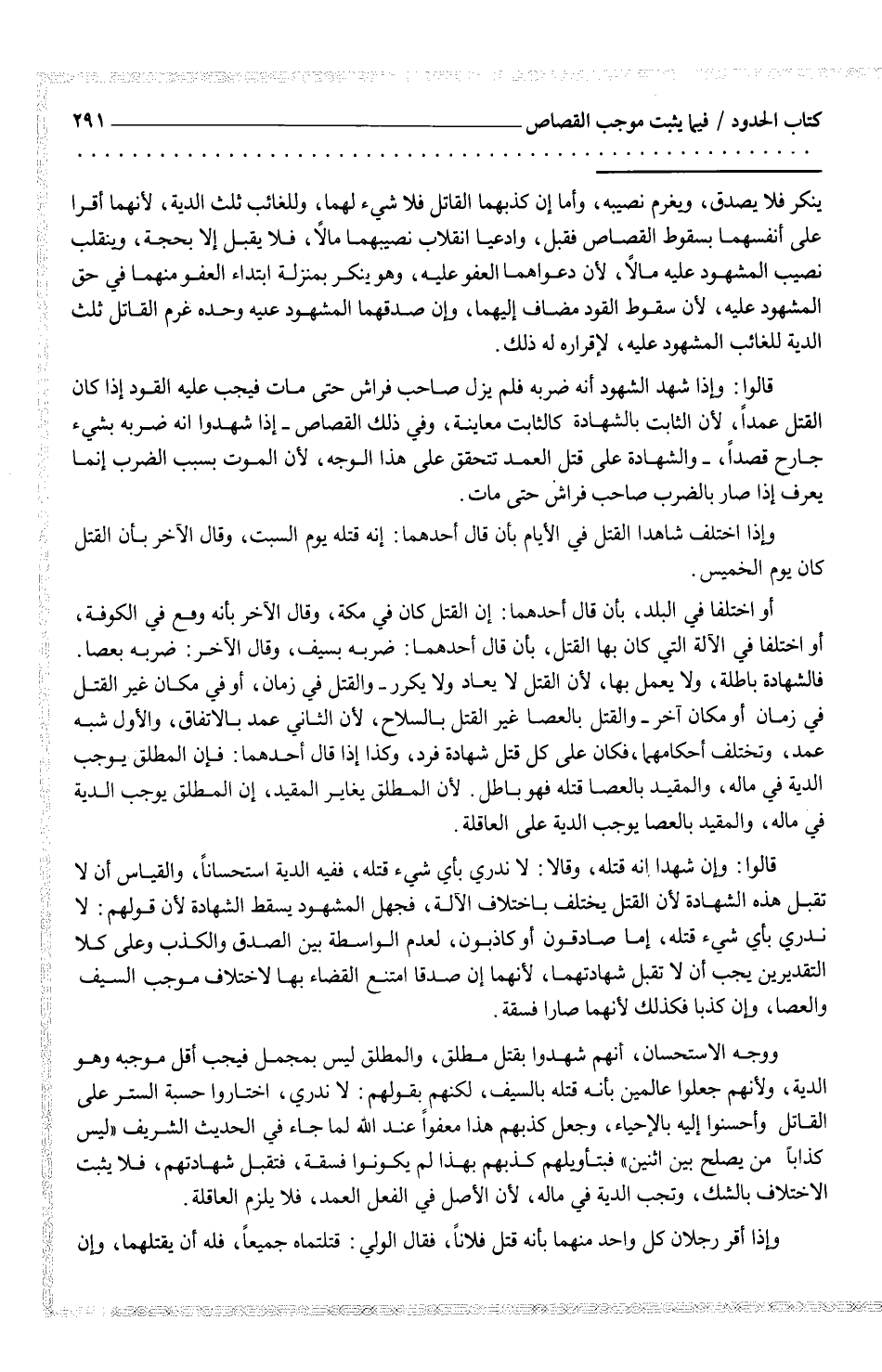 ووجه الاستحسان، انهم شهدوا بقتل مطلق، والمطلق ليس بمحمل فيجب اقل موجبه وهو الدية، ولأنهم جعلوا عالمين بأنه قتله بالسيف، لكنهم بقولهم: لا ندري، اختاروا حسبة الستر على القتل وأحسنوا إليه بالإحياء، وجعل كذبهم هذا معفواً عند الله لما جاء في الحديث الشريف (ليس كذاباً من يصلح بين اثنين) فبتأويلهم كذبهم بهذا لم يكونوا فسقة، فتقبل شهادتهم، فلا يثبت الاختلاف بالشك، وتجب الدية في مال، لأن الأصل في الفعل العمد، فلا يلزم العاقلة.