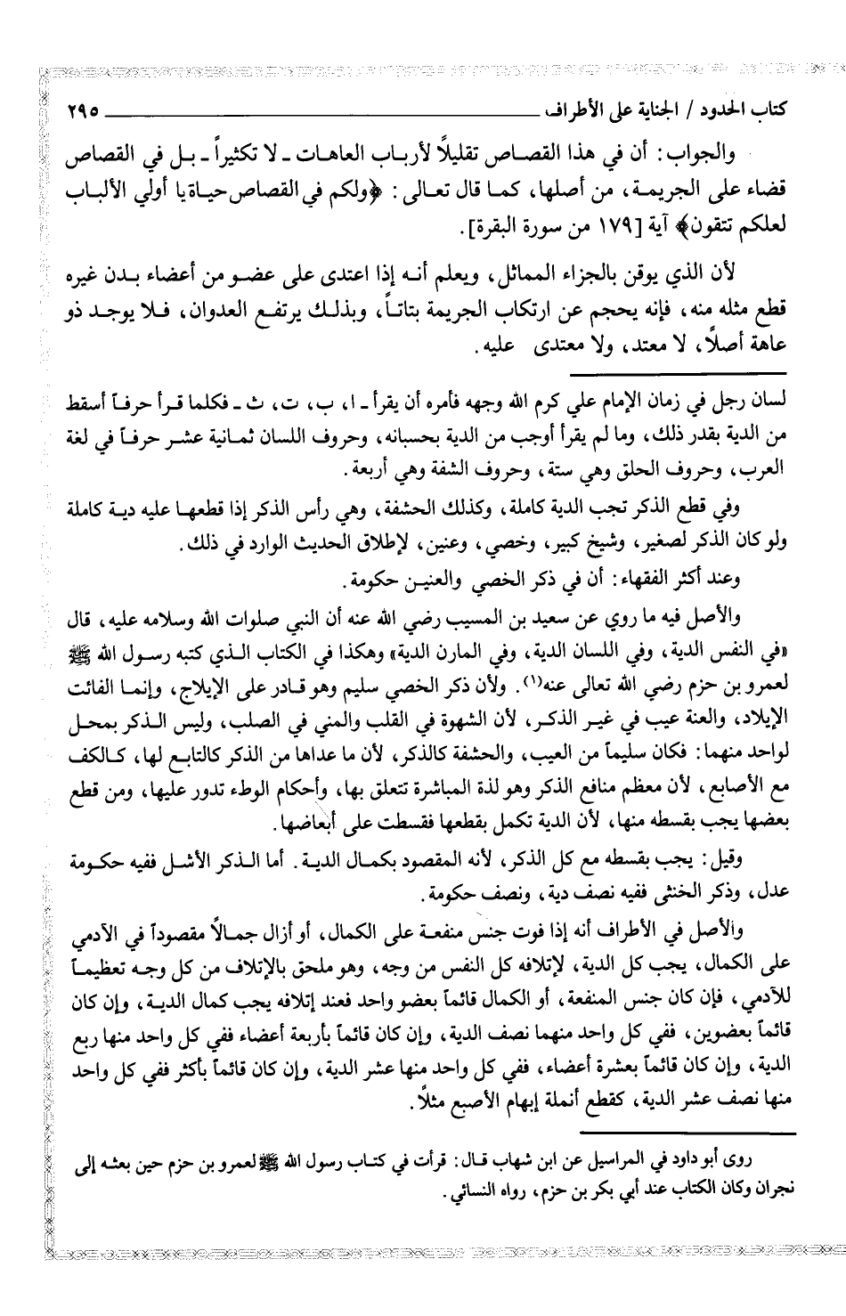 لسان رجل في زمان الإمام على كرم الله وجهه فأمره أن يقرأ - ا، ب، ت، ث - فكلما قرأ حرفاً أسقط من الدية بقدر ذلك، ومالم يقرأ أوجب من الدية بحسبانه، وحروف اللسان ثمانية عشر حرفاً في لغة العرب، وحروف الحلق وهي ستة، وحروف الحلق وهي ستة، وحروف الشفة وهي أربعة.