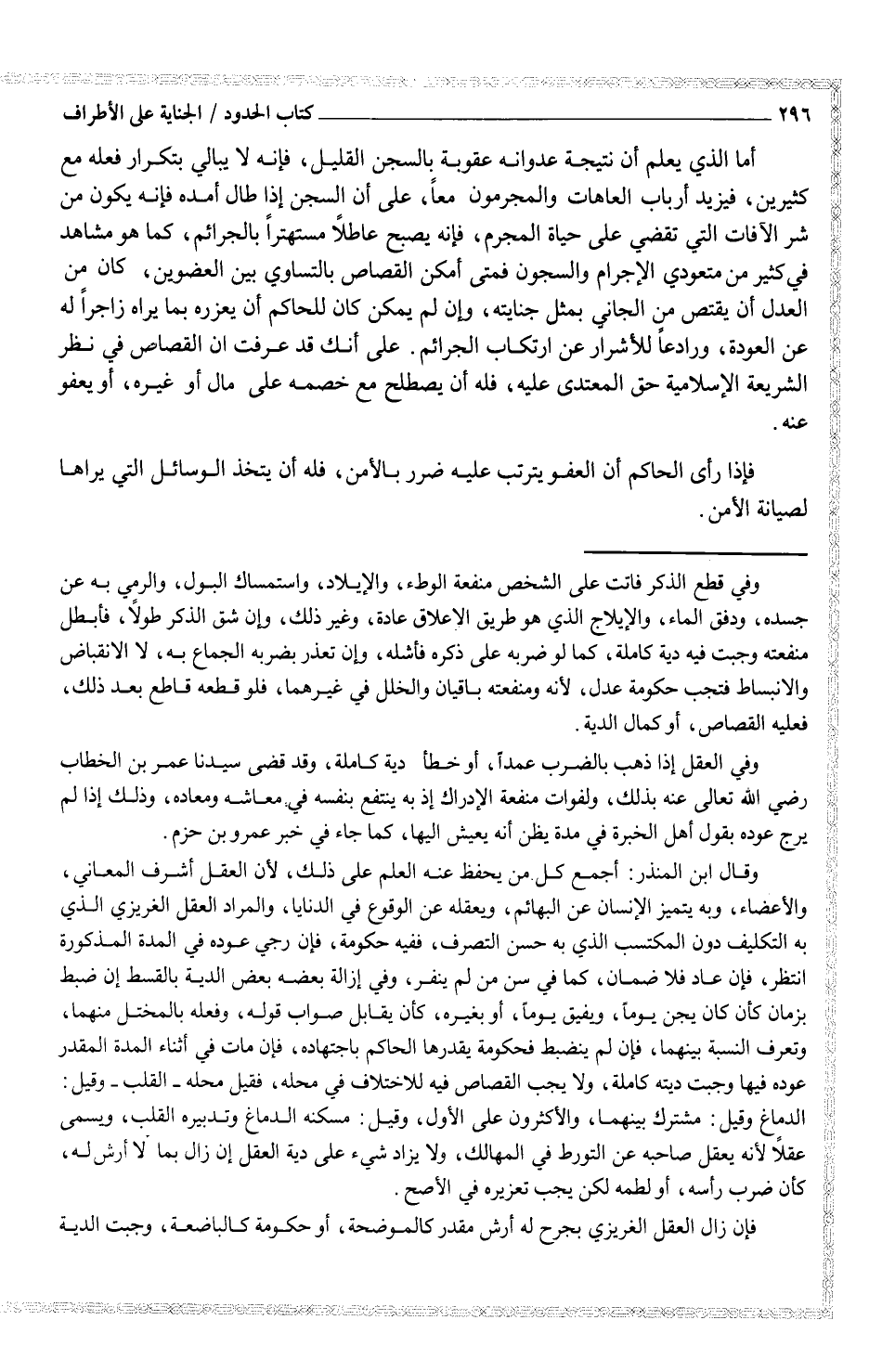وفي العقل إذا ذهب بالضرب عمداً، أو خطأ دية كاملة، وقد قضى سيدنا عمر بن الخطاب رضي الله تعالى عنه بذلك، ولفوات منفعة الإدراك إذ به ينتفع بنفسه في معاشه ومعاده، وذلك إذا لم يرج عوده بقول أهل الخبرة في مدة يظن أنه يعيش إليها، كما جاء في خبر عمرو بن حزم.