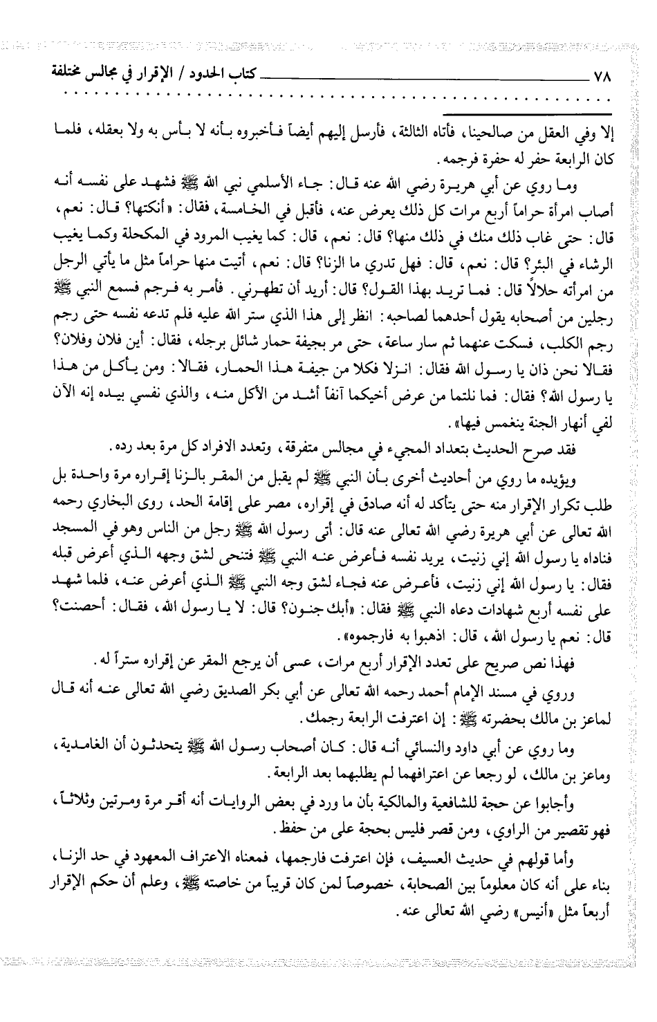 ويؤيده ما روي من أحاديث أخرى بأن النَبِي صَلَى اللَّهُ عَلَيْهِ وَسَلَم لم يقبل من المقر بالزنا إقراره مرة واحدة بل طلب تكرار الإقرار منه حتى يتأكد له أنه صادق في إقراره، مصر على إقامة الحد، روي البخاري رحمه اللَّه تعالى عن أبي هريرة رَضِيَ اللَّهُ عَنْهُ قَالَ: أتى رَسُول اللَّه صَلَى اللَّهُ عَلَيْهِ وَسَلَم رجل من الناس وهو في المسجد فناداه يَا رَسُولَ اللَّه إني زنيت، فأعرض عنه النَبِي صَلَى اللَّهُ عَلَيْهِ وَسَلَم فتنحى لشق وجهه الذي أعرض قبله فقال: يَا رَسُولَ اللَّه إني زنيت، فأعرض عنه فجاء لشق وجه النَبِي صَلَى اللَّهُ عَلَيْهِ وَسَلَم الذي أعرض عنه، فلما شهد على نفسه أربع شهادات دعاه النَبِي صَلَى اللَّهُ عَلَيْهِ وَسَلَم فقال: (أبك جنون؟ قَالَ: لا يَا رَسُولَ اللَّه، فقال: أحصنت؟ قَالَ: نعم يَا رَسُولَ اللَّه، قَالَ: اذهبوا به فارجموه) .