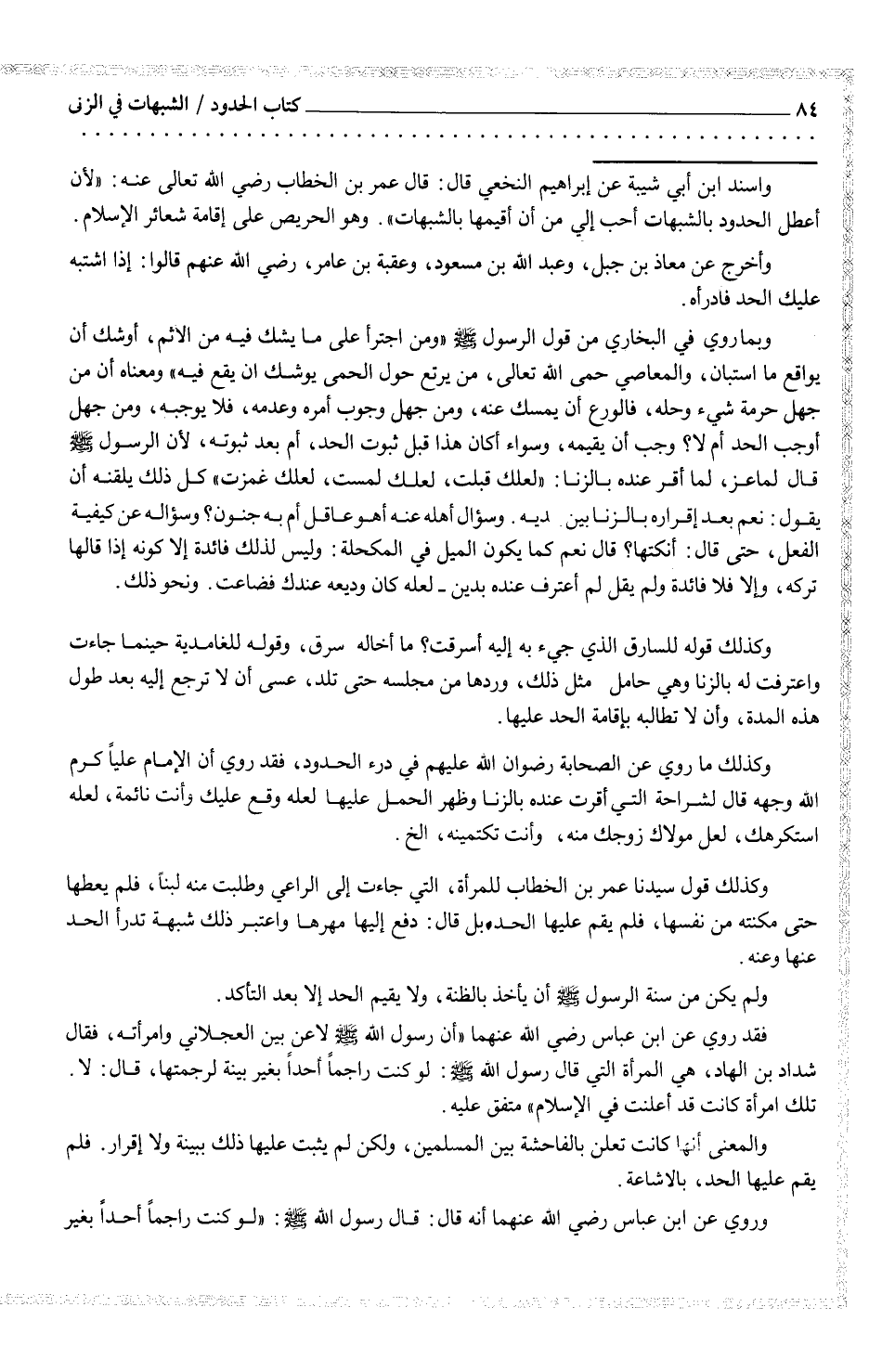 واسند ابن أبي شيبة عن ابراهيم النخعي قَالَ: قَالَ عمر بن الخطاب رَضِيَ اللَّهُ عَنْهُ: (لأن أعطل الحدود بالبهات أحب إلي من أن أقيمها بالشبهات) . وهو الحريص على إقامة شعائر الإسلام.