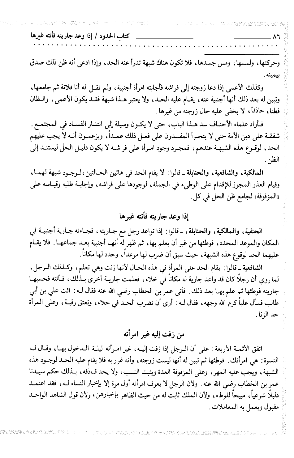 فأراد علماء الأحناف سد هذا الباب، حتى لا يكون وسيلة إلى انتشار الفساد في المجتمع. شفقة على دين الأمة حتى لا يتجرأ المفسدون على فعل ذلك عمداً، ويزعمون أنه لا يجب عليهم الحد، لوقوع هذه الشبهة عندهم، فمجرد وجود امرأة على فراشه لا يكون دليل الحل ليستند إلى الظن.