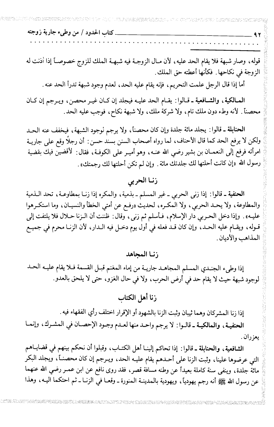 الحنابلة - قالوا: يجلد مائة جلدة وإن كان محصناً، ولا يرجم لوجود الشبهة، فيخفف عنه الحد ولكن لا يرفع الحد كما قَالَ الأحناف، لما رواه أصحاب السنن بسند حسن: أن رجلاً وقع على جارية امرأته فرفع إلى النعمان بن بشير رَضِيَ اللَّهُ عَنْهُ، وهو أمير على الكوفة، فقال: لأقضين فيك بقضية رسول اللَّه (إن كانت أحلتها لك جلدتك مائة. وإن لم تكن أحلتها لك رجمتك) .