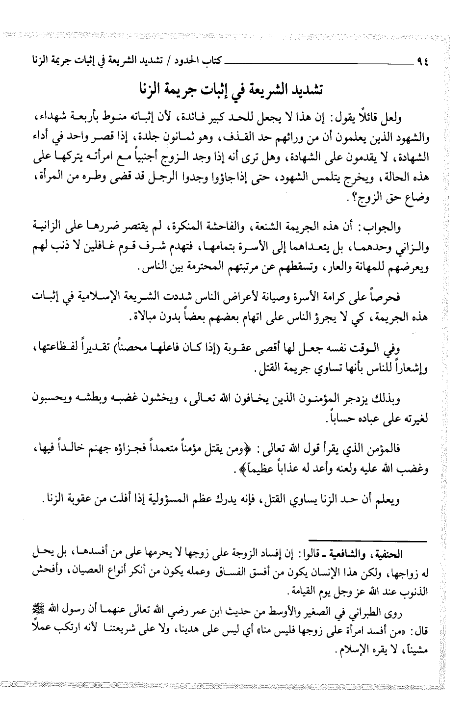 ويعلم أن حد الزنا يساوي القتل، فإنه يدرك عظم المسؤولية إذ افلت من عقوبة الزنا.